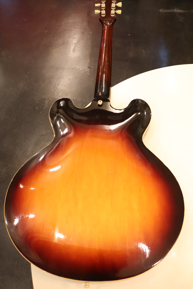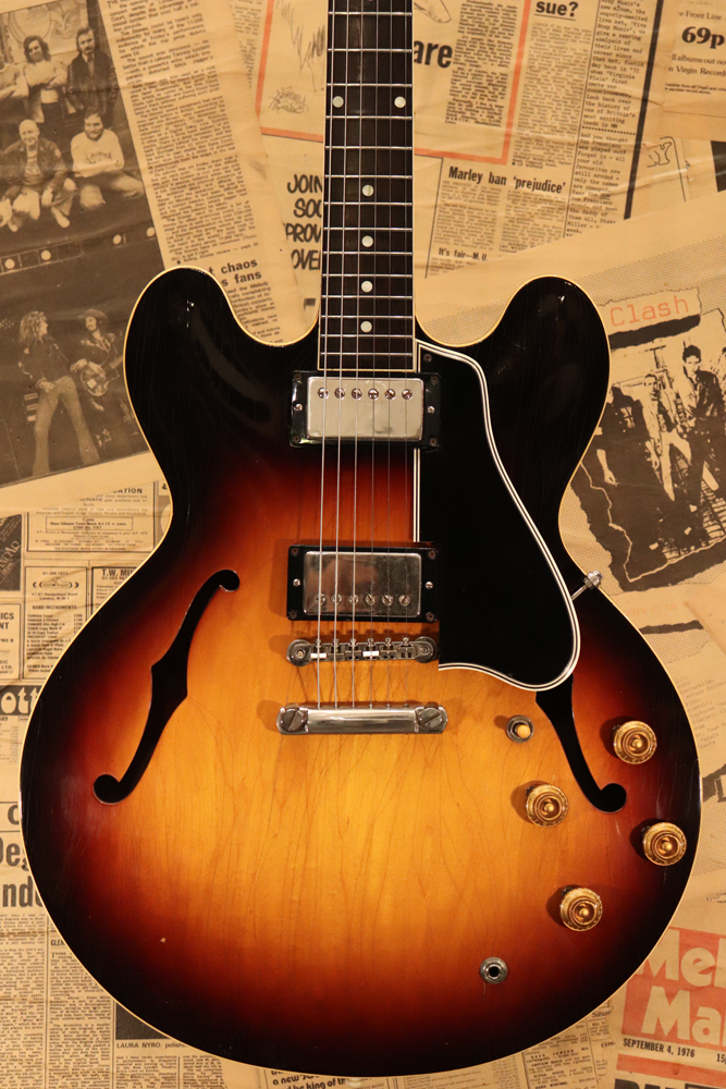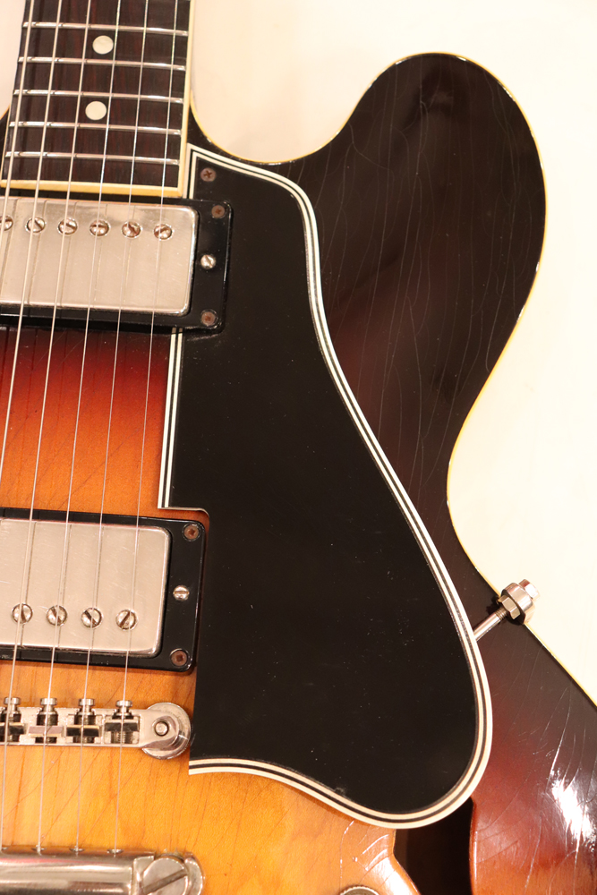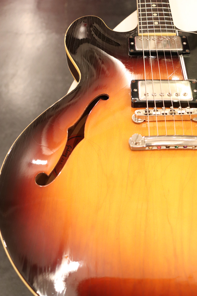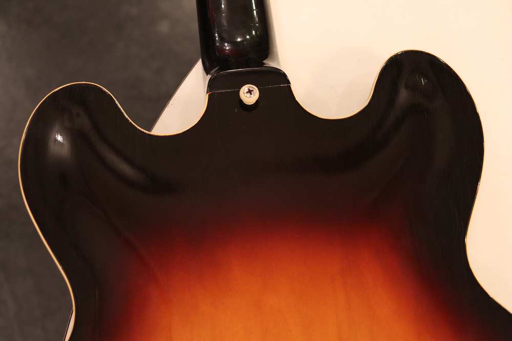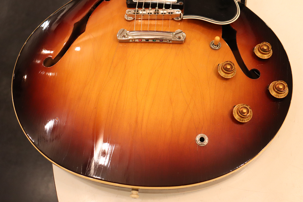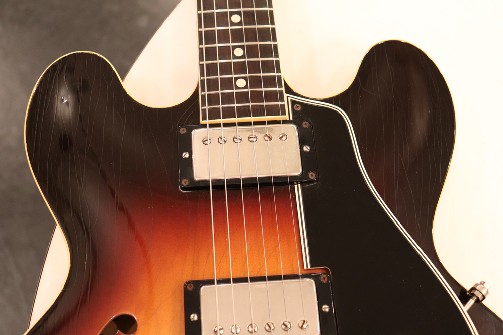 外観は、サンバースト・カラーの艶も鮮やかで、この時期の“335”の特徴でもある、黒に近いブラウンからグラデーションを掛け、フェイディングしがちな外周部の顔料系の赤い部分も綺麗に残ったバーストカラーは、新品時に近いカラーリングを留めた機体です