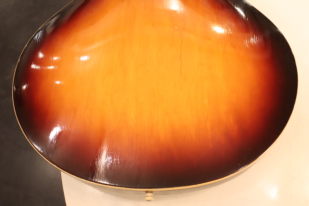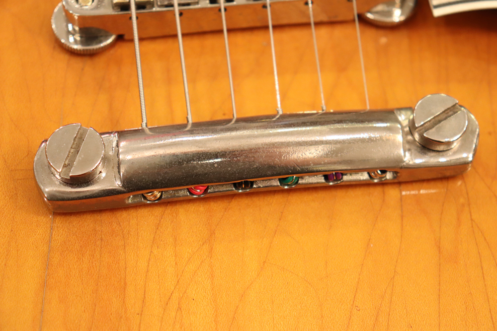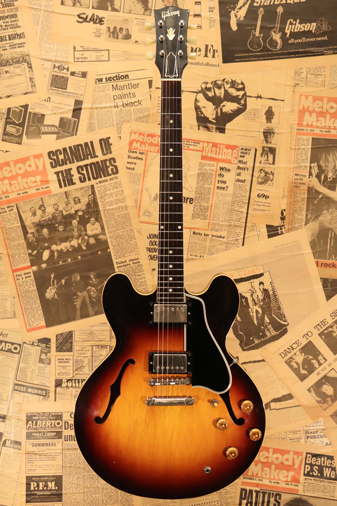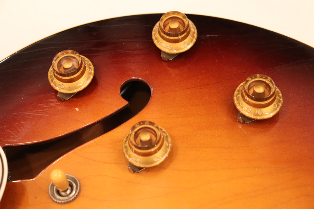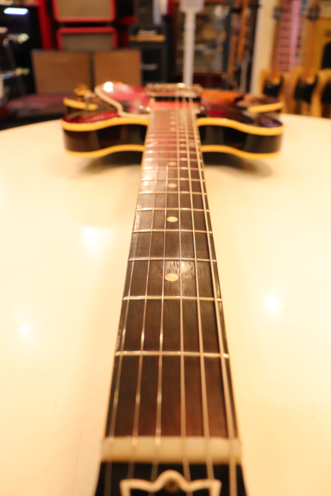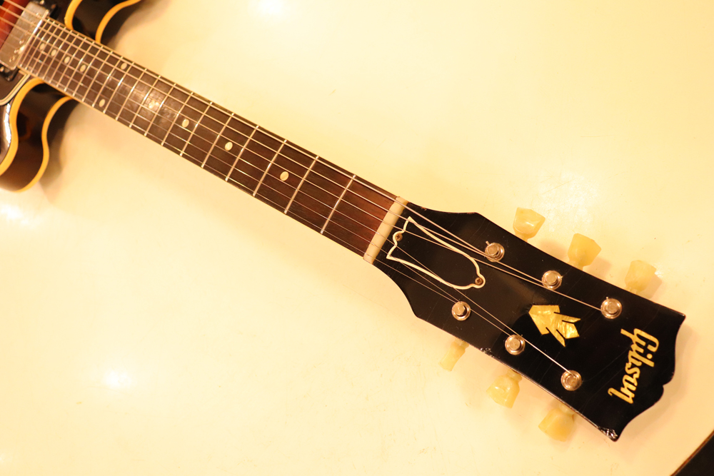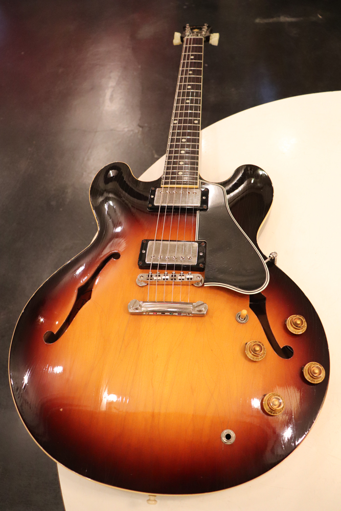 外観は、サンバースト・カラーの艶も鮮やかで、この時期の“335”の特徴でもある、黒に近いブラウンからグラデーションを掛け、フェイディングしがちな外周部の顔料系の赤い部分も綺麗に残ったバーストカラーは、新品時に近いカラーリングを留めた機体です