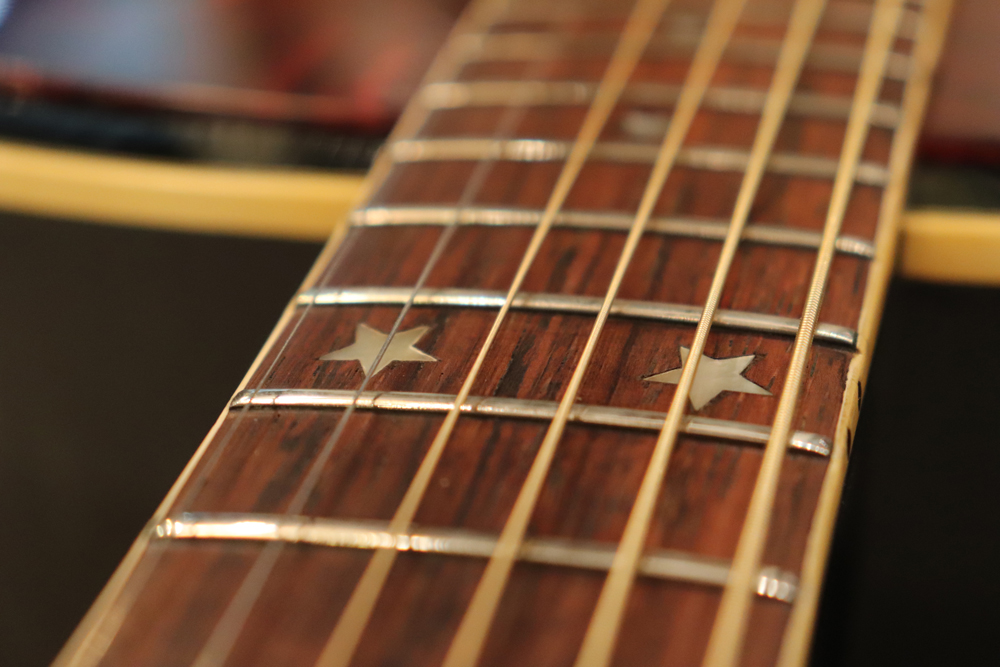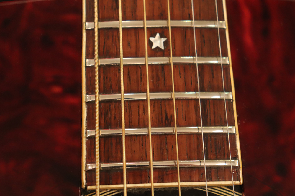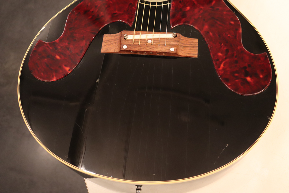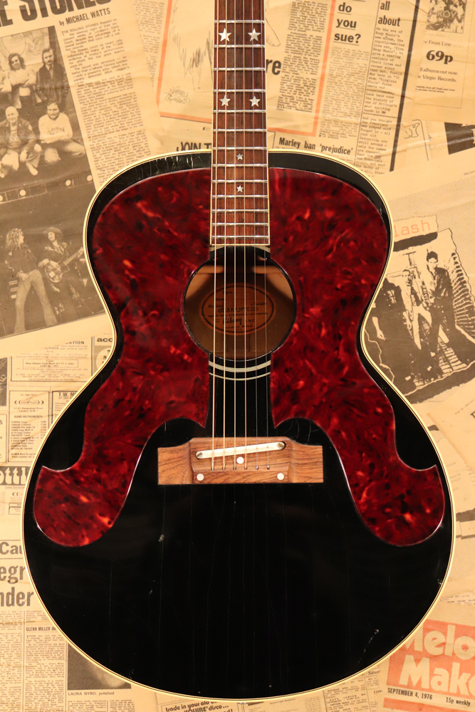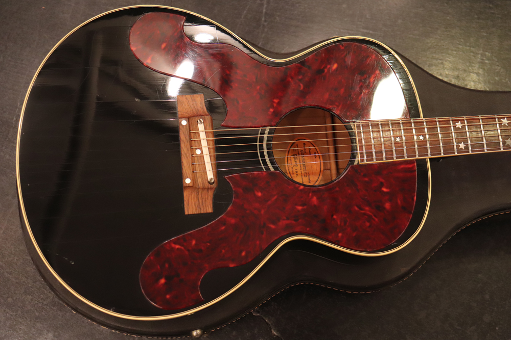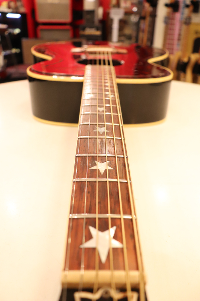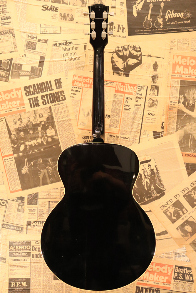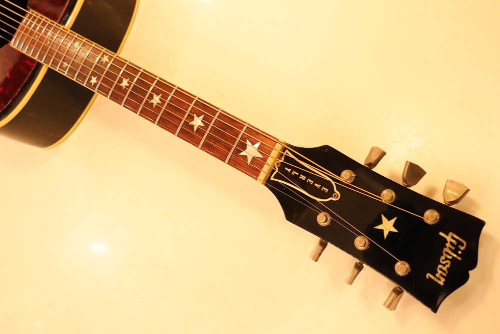 J−185をベースに、幾分薄いボディ厚を採用し、指板とヘッドにはスター・インレイを、精悍なブラック・フィニッシュが施されたボディには大型で左右に施されたタートイズ・シャル柄のピックガードが特徴で、いかにも“スター“が持つ、ギブソン・アコースティック・モデルの中でも一際ファンシーなモデルです