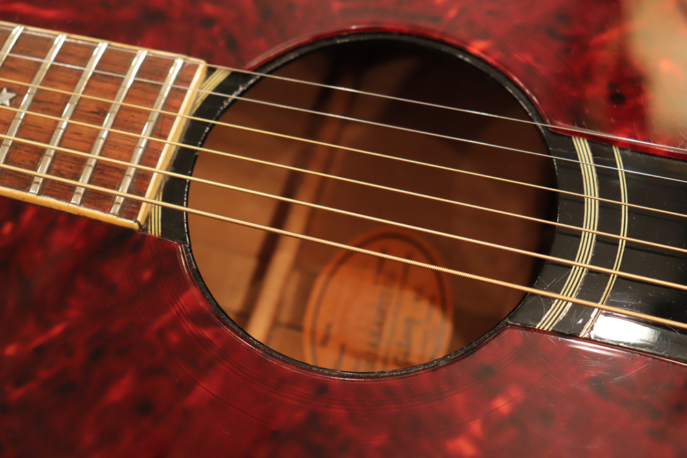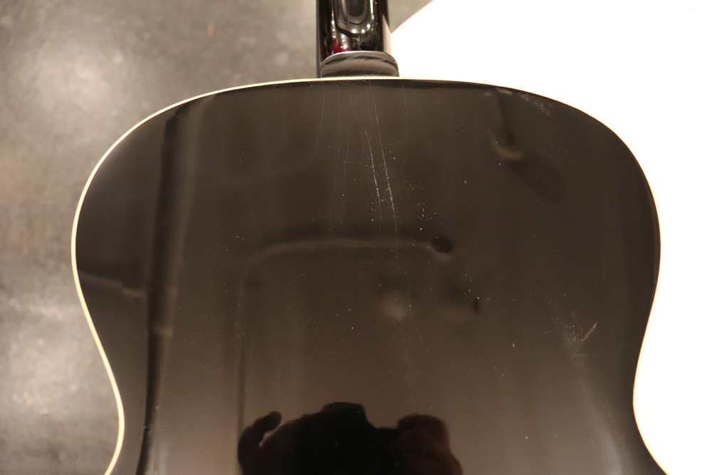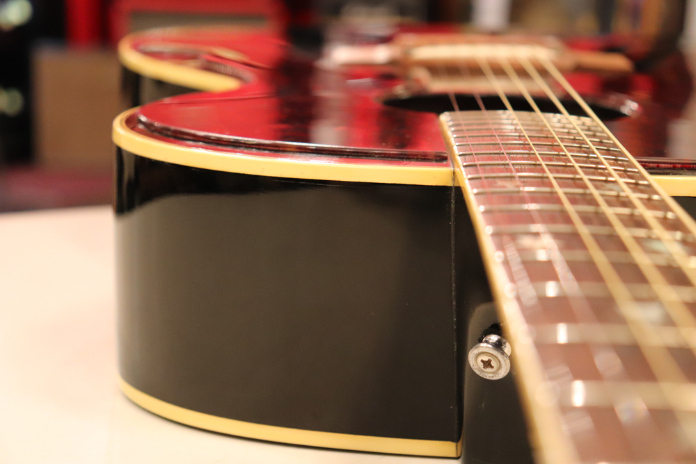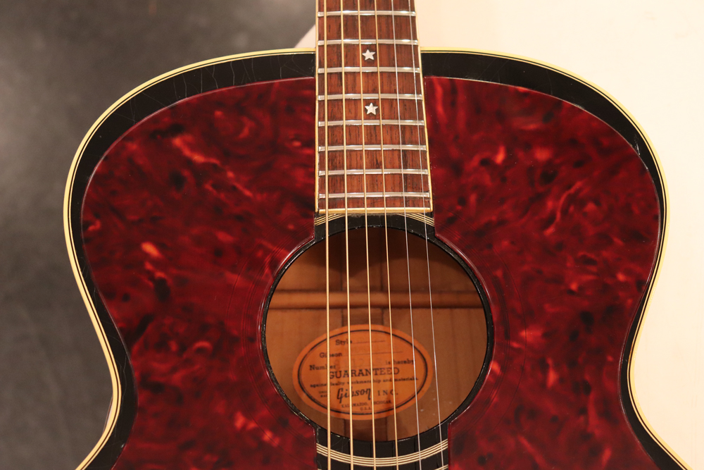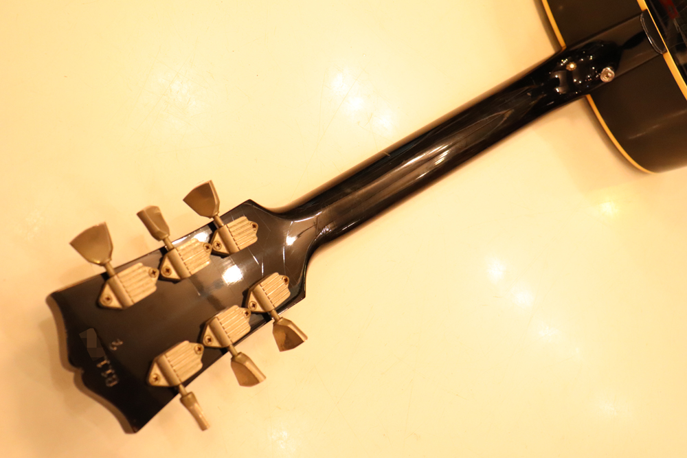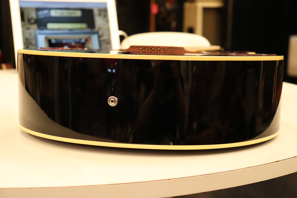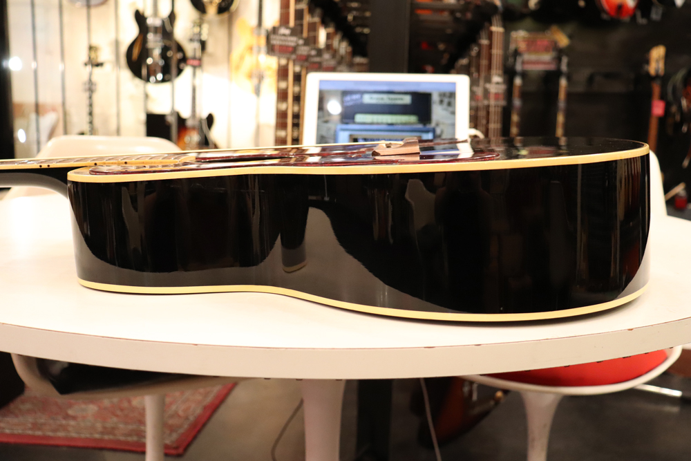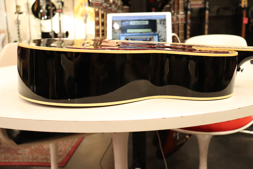 薄めのボディ圧や、大きなピックガード、特異な弦の張り方等から、サウンドに懸念を持つ方もいらっしゃると思いますが、マテリアルはシトカ・スプルース・トップにホンジュラス・マホガニーのボディ、ネックと、この時期のギブソン定番のマテリアルを使用しており、実はストロークでは意外とパワフルに、且つ単音での繊細なトーンも併せ持つ