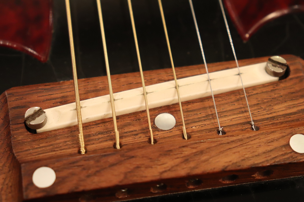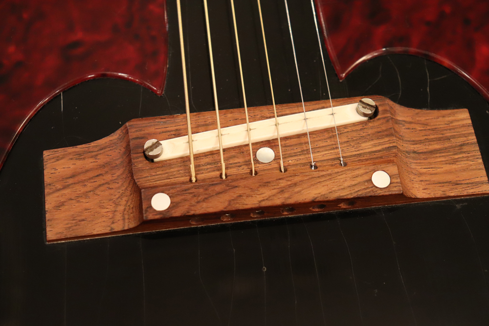 経年劣化により崩壊をしてしまいギター本体にも影響を及ぼす事もある、当時のセルロイド製ピックガードは