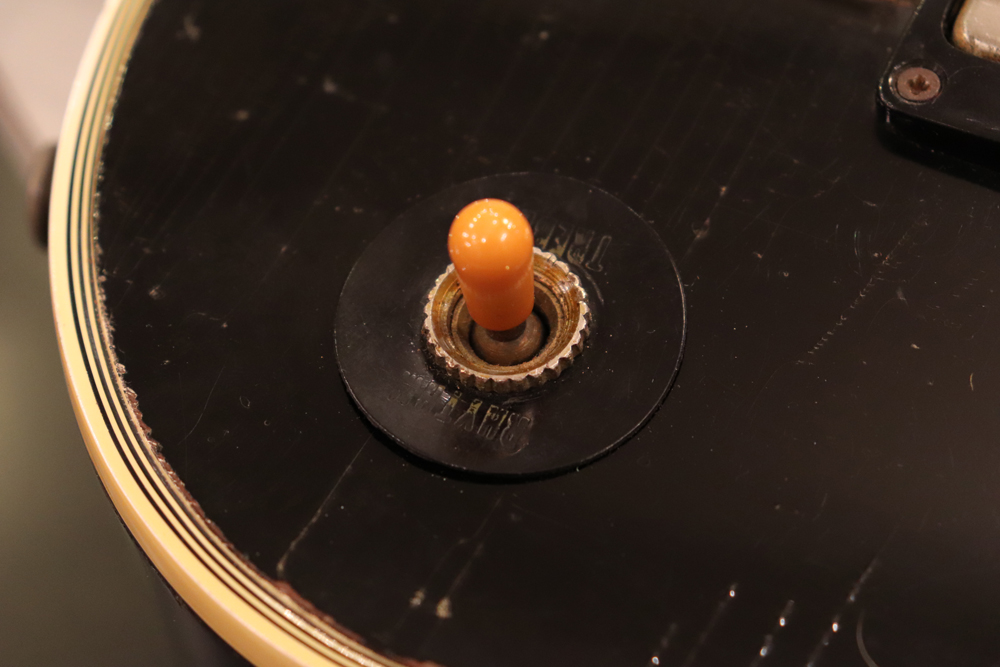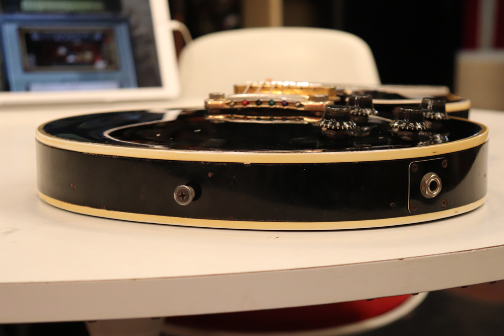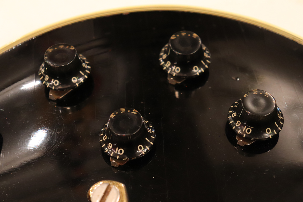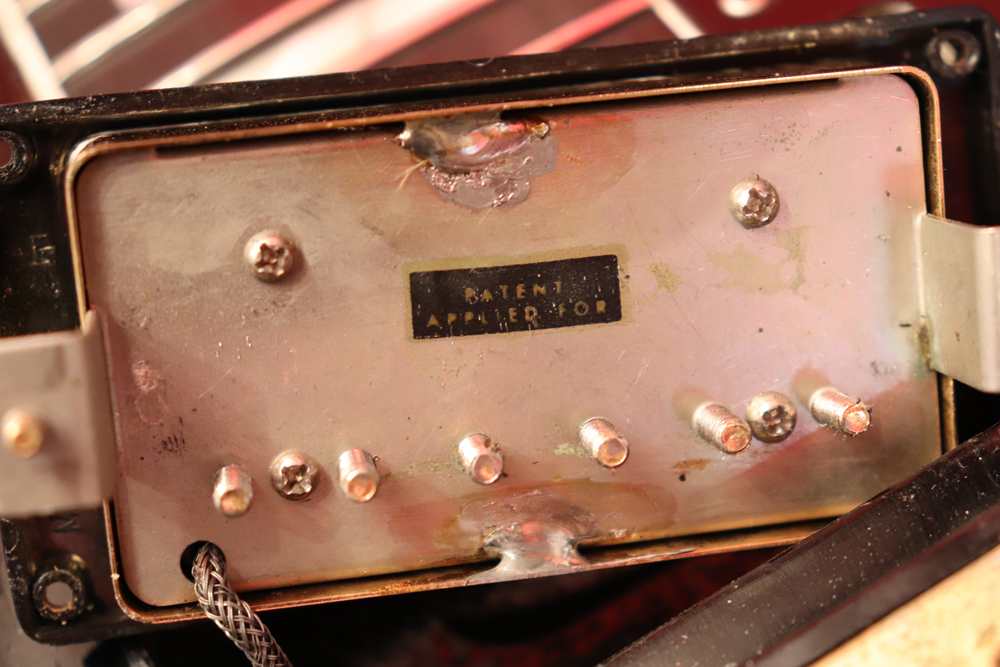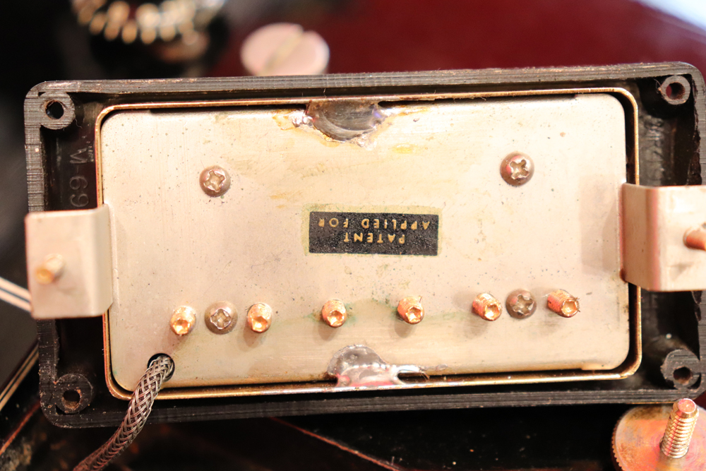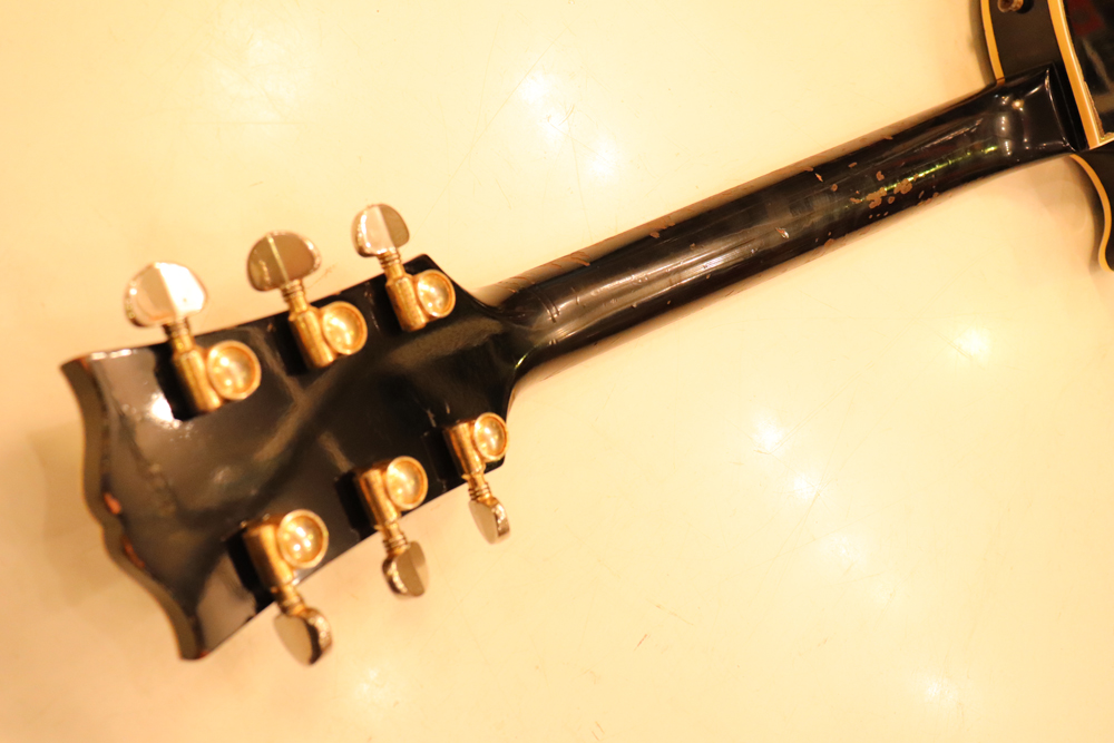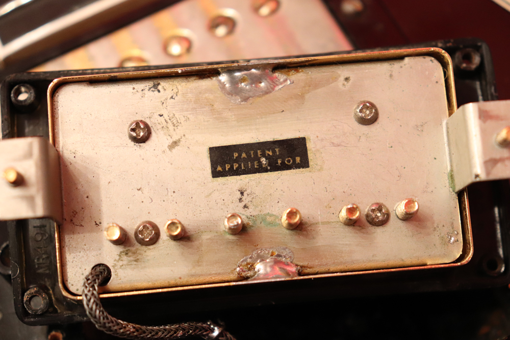こちらは、そのカスタム最初のマイナーチェンジとして57年に登場した、"Patent Applied For" のデカールが貼られたハムバッキング・ピックアップを3基搭載されたセカンド・バージョンで、グローバー 102G ペグが標準搭載された