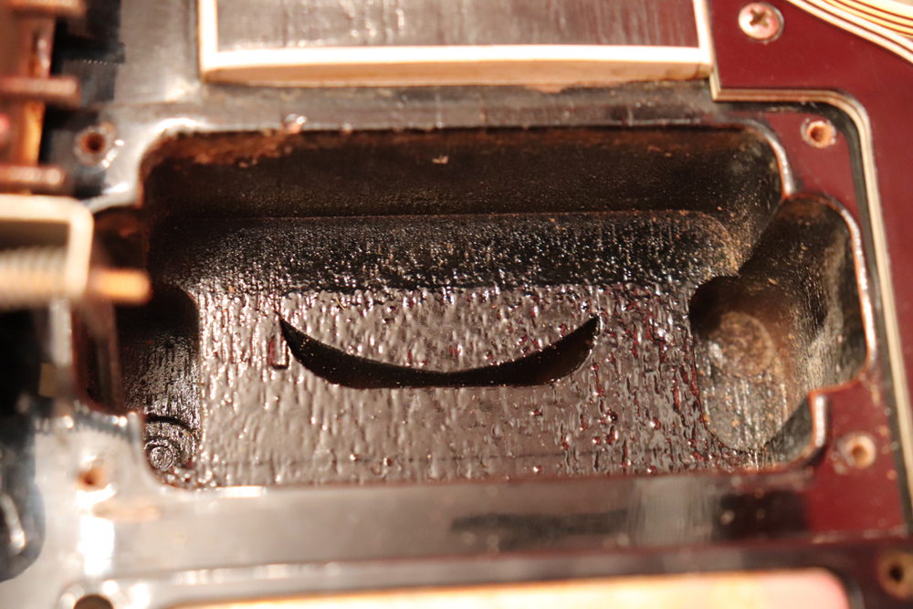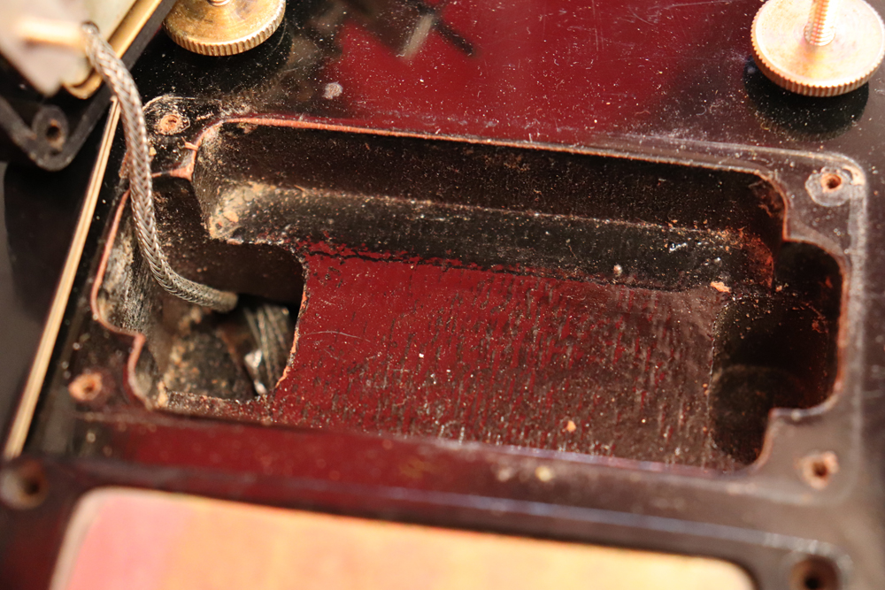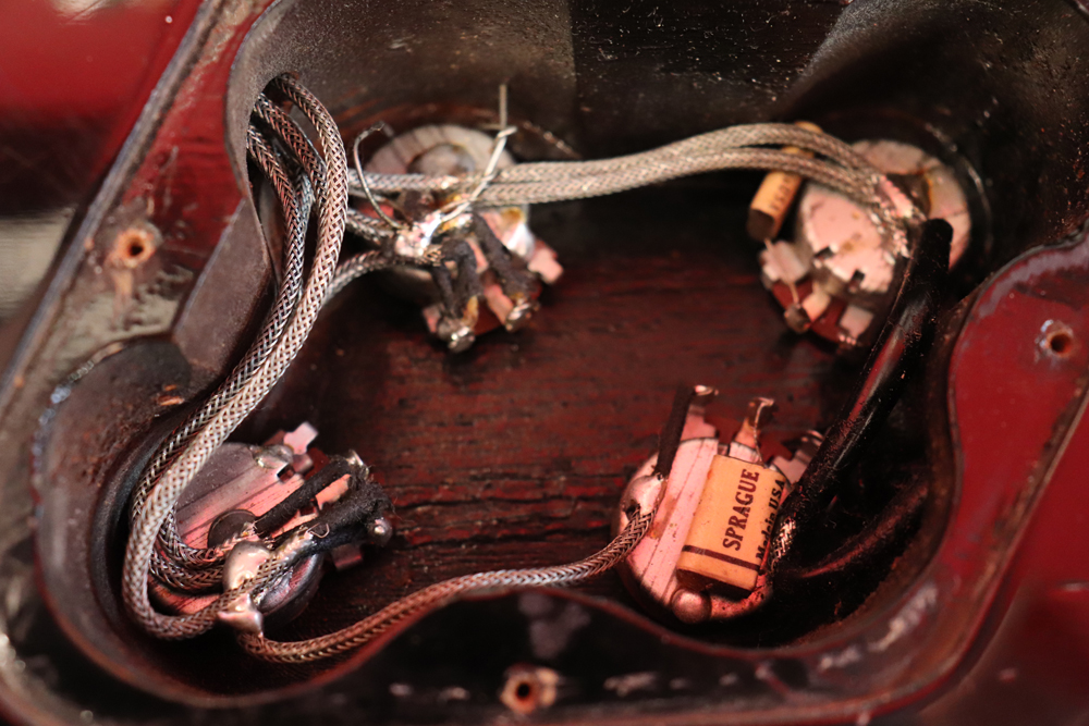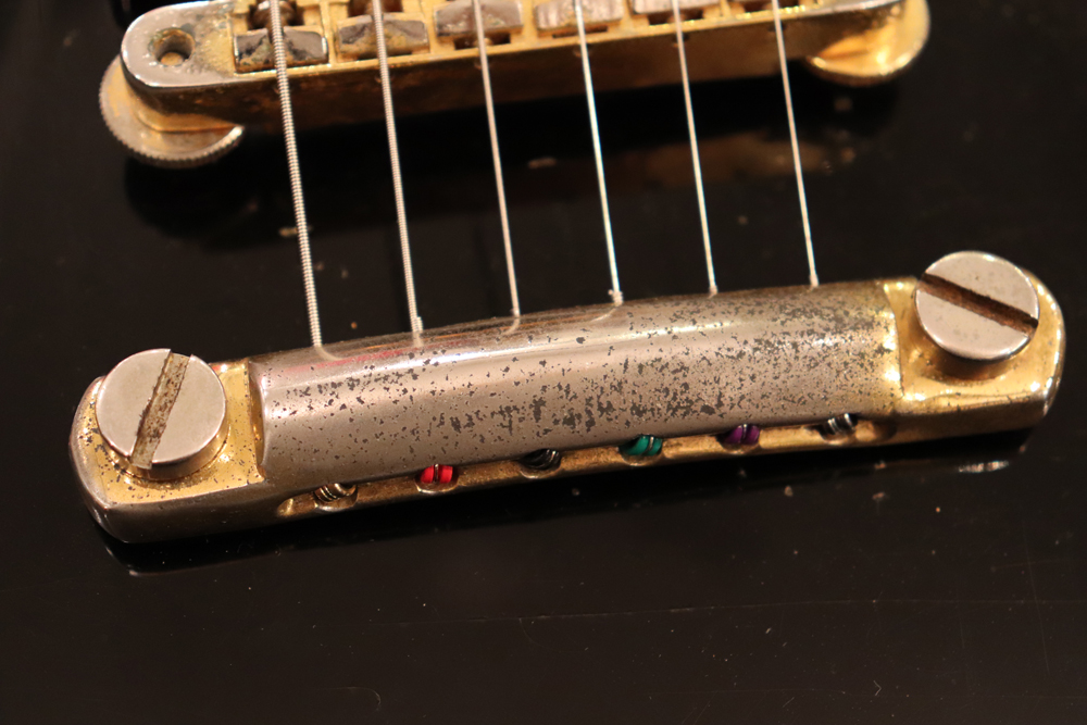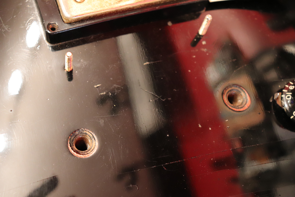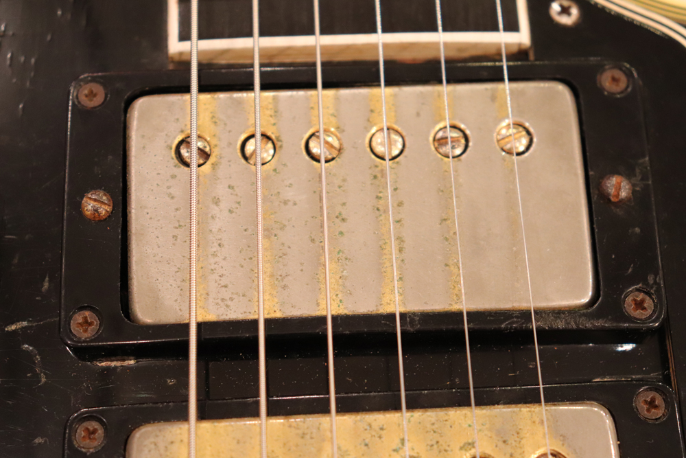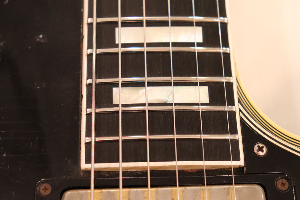 こちらは、そのカスタム最初のマイナーチェンジとして57年に登場した、"Patent Applied For" のデカールが貼られたハムバッキング・ピックアップを3基搭載されたセカンド・バージョンで、グローバー 102G ペグが標準搭載された