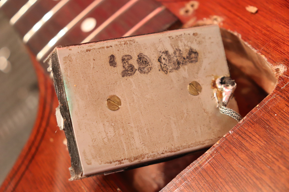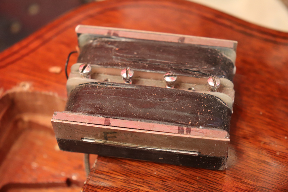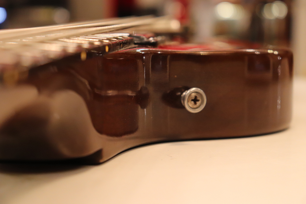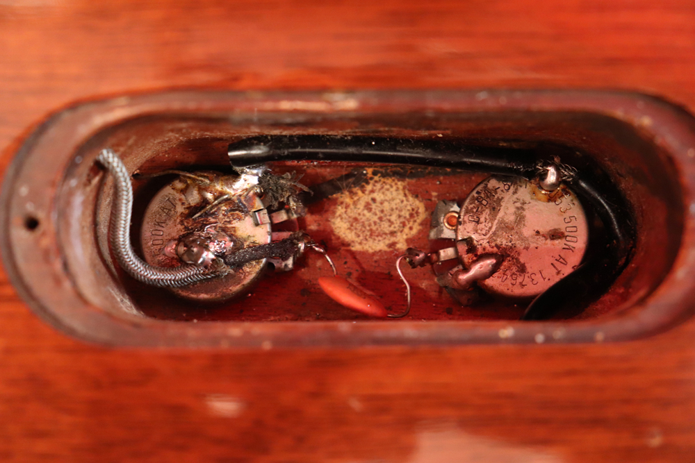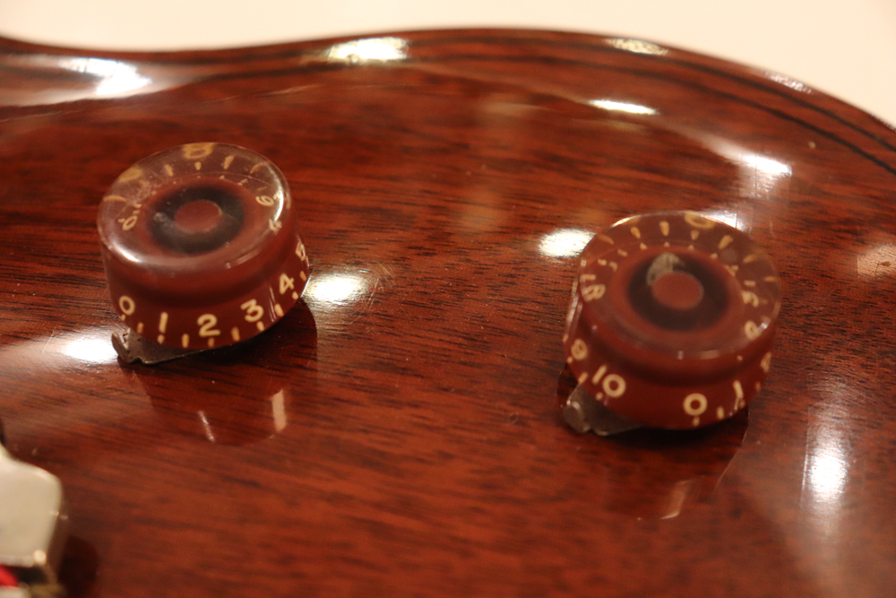 ハムバッキング・ピックアップに換装されています また、ポットが60年代の物に、ペグボタンがリプレイスされています
