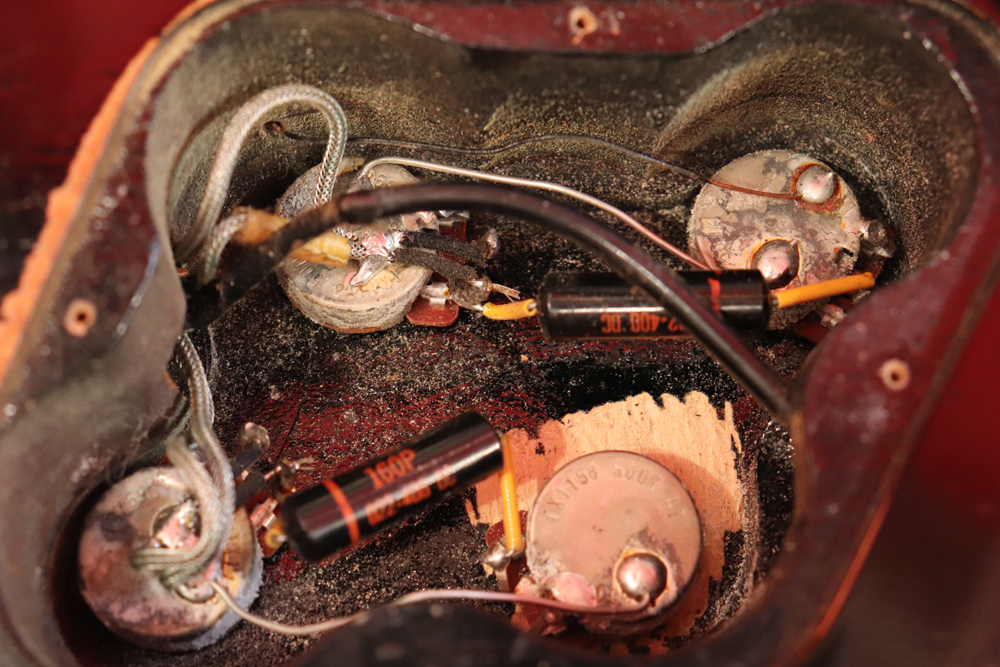 内容も、ピックアップを含め主要部はオリジナルですが、スイッチチップのリプレイスと、コントロール・ノブの一つが同仕様ながら別の個体から移されています