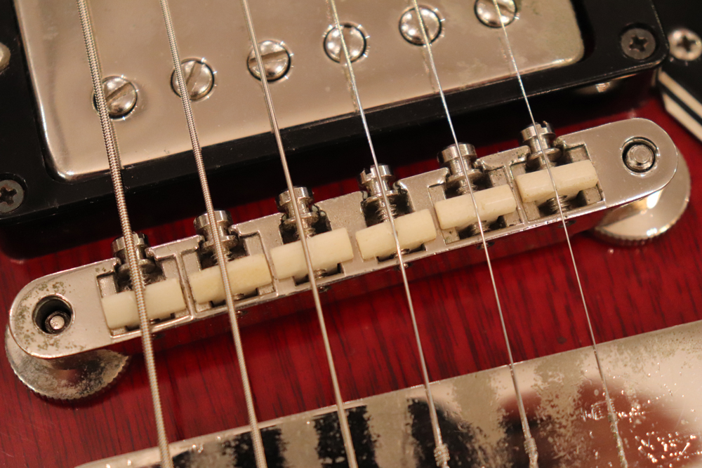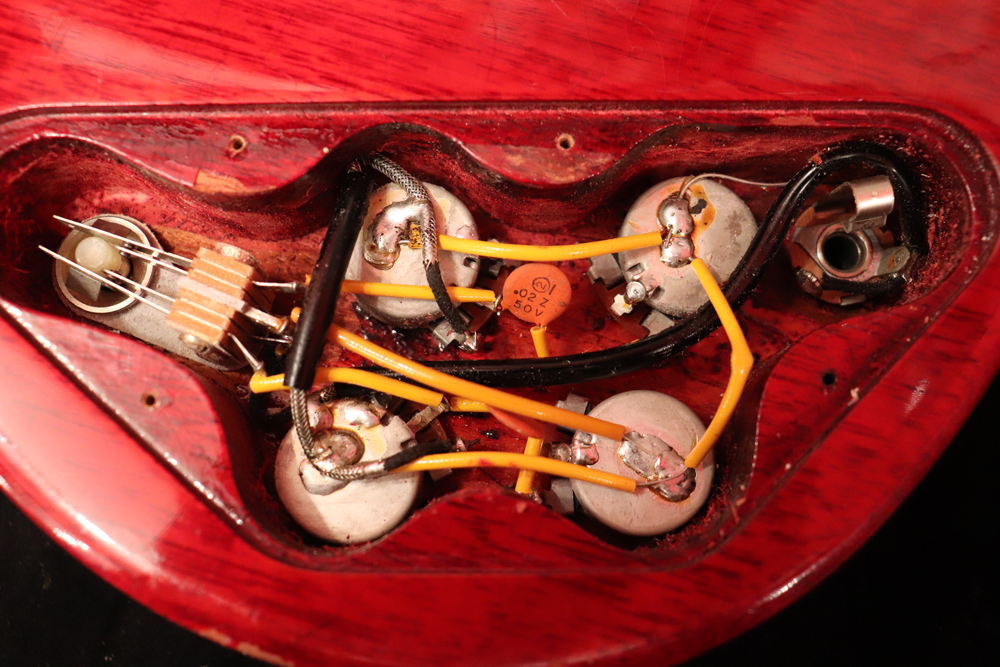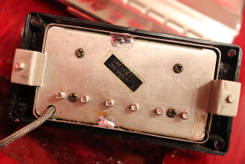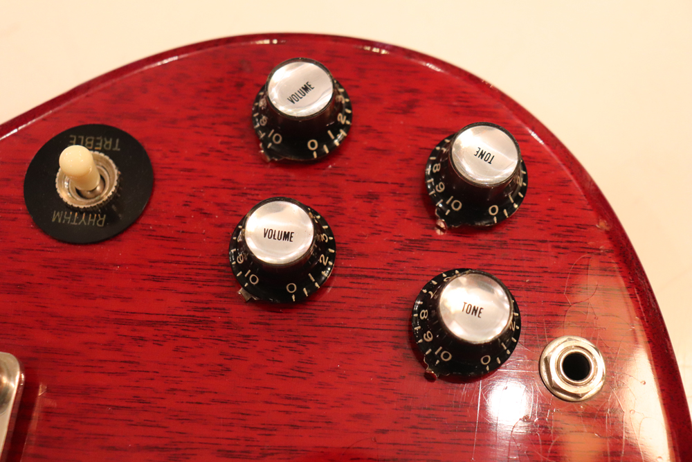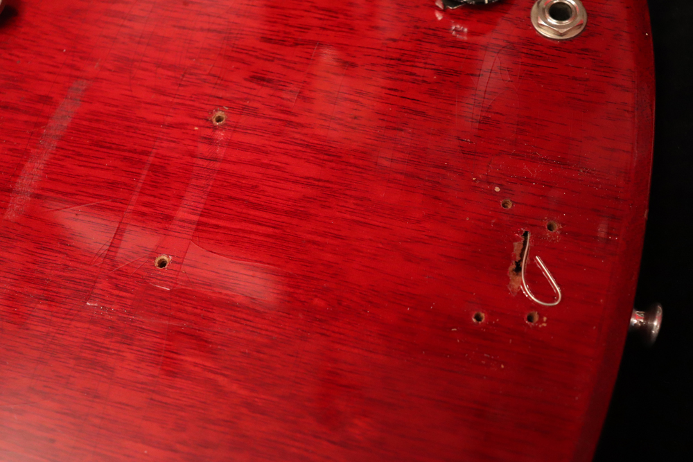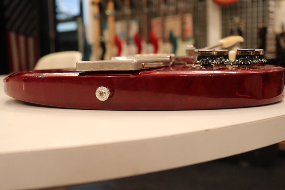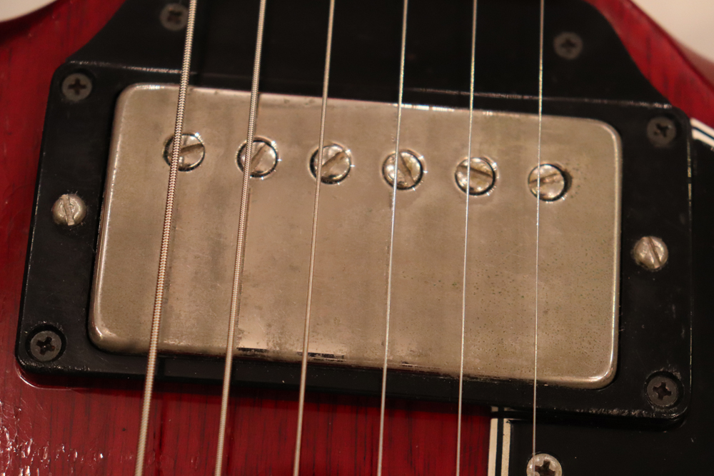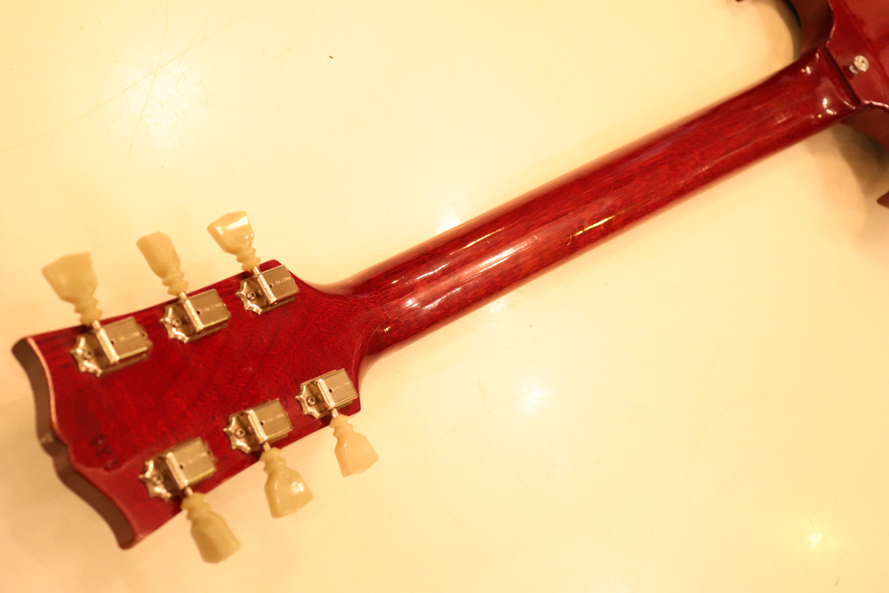 この時期の特徴としては、SGモデルの中でも一番太めなグリップを持ち、その分"SG"とは思えぬファットなトーンが特徴で、サウンドも60’s"P.A.F"と同様な内容を持つ、初期スクエア・ウインドゥ・ナンバード・パフ・ピックアップの、メロウながらもガッツのあるロック・フィール溢れるグッド・トーンを持った固体です!