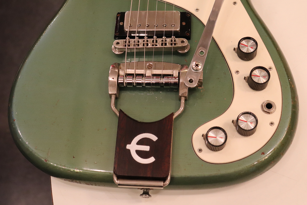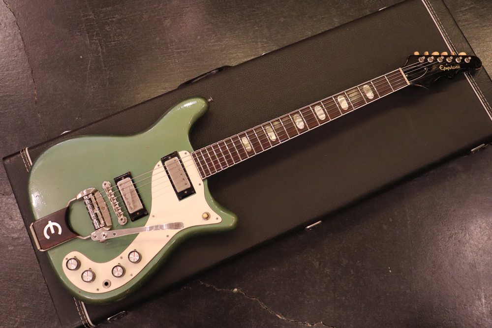 ボディは、ホンジュラス・マホガニーを使用した非対称のホーンテッド・ダブルカッタウェイ形状で、ピックアップには、主にエピフォンのモデルに採用されたパテント・ナンバード・デカールが貼られた“ミニ・ハムバッカー“を2機搭載、ネックにはバインディングとオーバル形状の指板インレイが施されており、65年当時ギブソン・ブランドの“SG・スタンダード“と同様な位置付けのモデルです