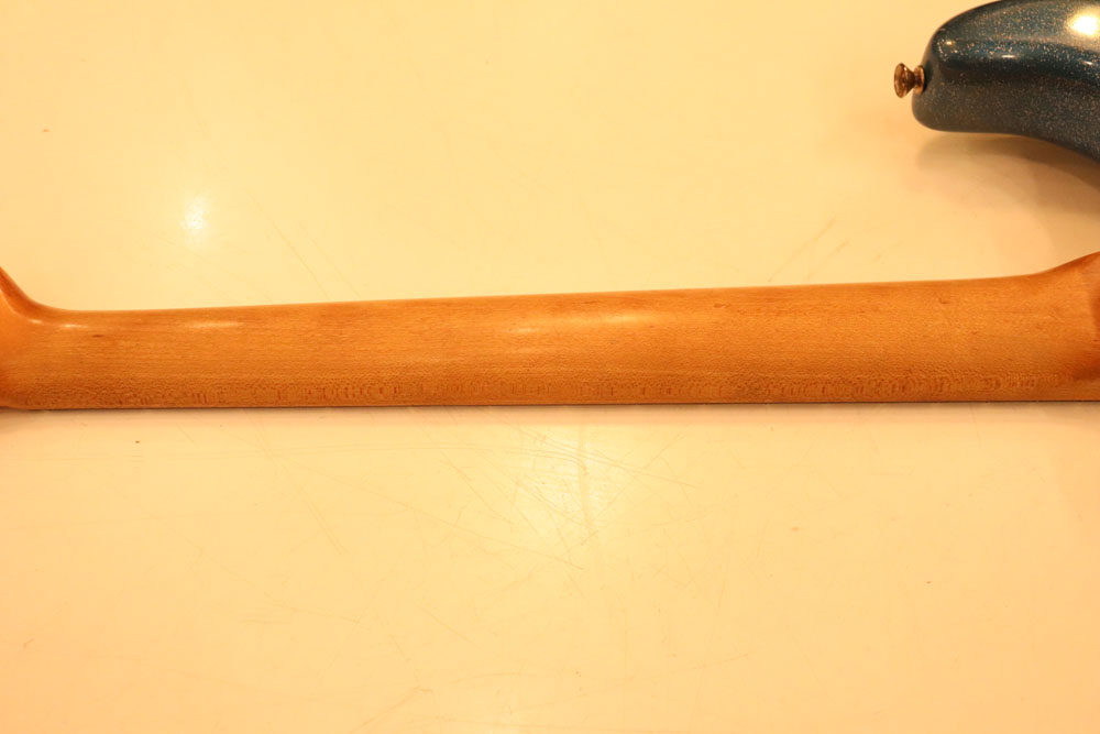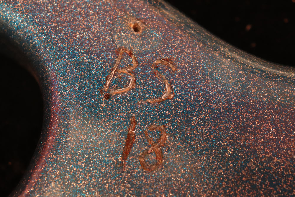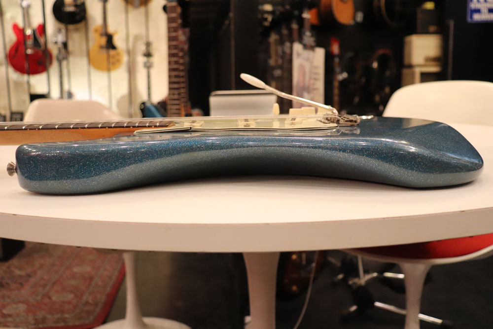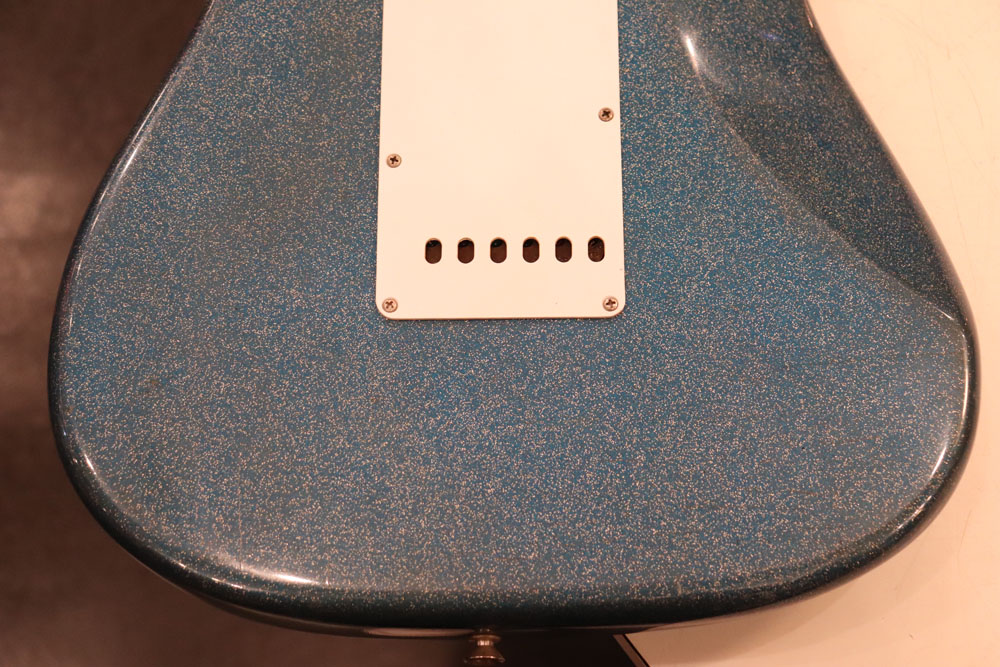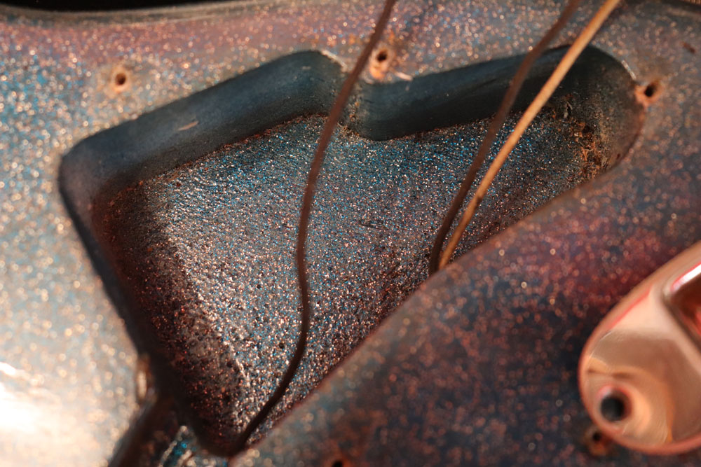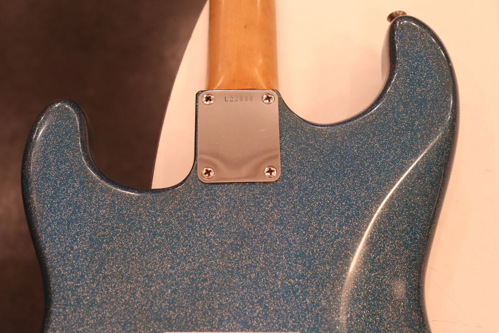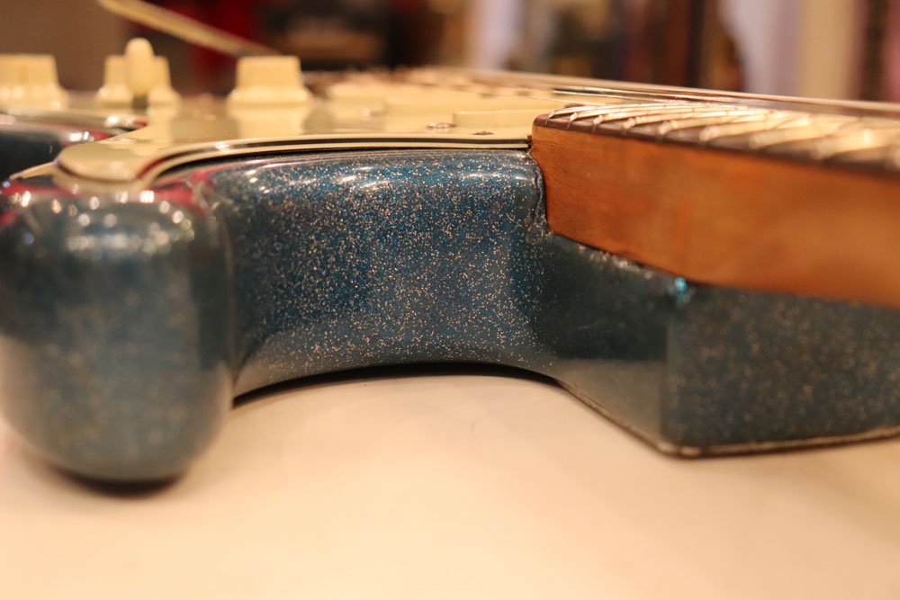 塗装自体は年式相応な古い時代に塗装されているようで、ボディ内部には“BSP”と言う文字が、はんだコテを使った焼印で刻まれています これはフェンダー・ファクトリーが再塗装(60年代のカタログにはユーザー向けにカラーチャート内のカラーでの再塗装を受け付けている、と表記されていました) を請けをった時にボディ内部に施す“印し”の方法の一つと同様です 又、ボディ全体はクリアトップコートのオーバースプレーが施されている様に見えますが、セルロース・ラッカーでのスパークル・フィニッシュの場合は、トップコートの経年劣化により粒の粗い大きいメタルフレークが表面に現れて来てザラザラしてしまったた肌を治める為に、後年になって施されているのではないかと考えています