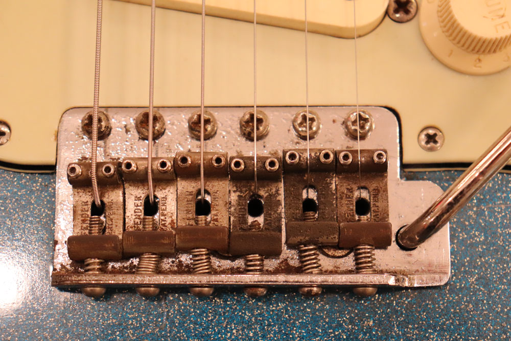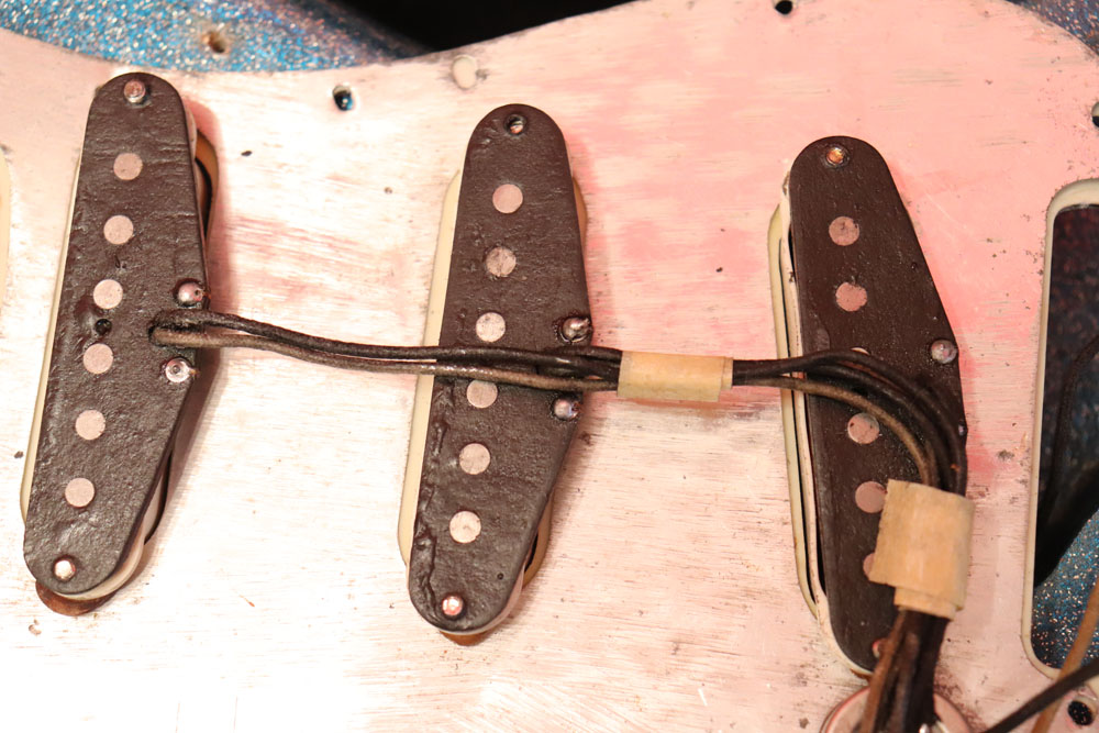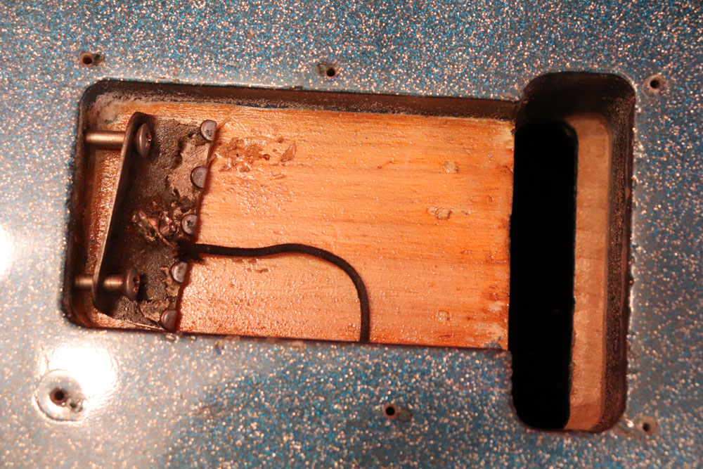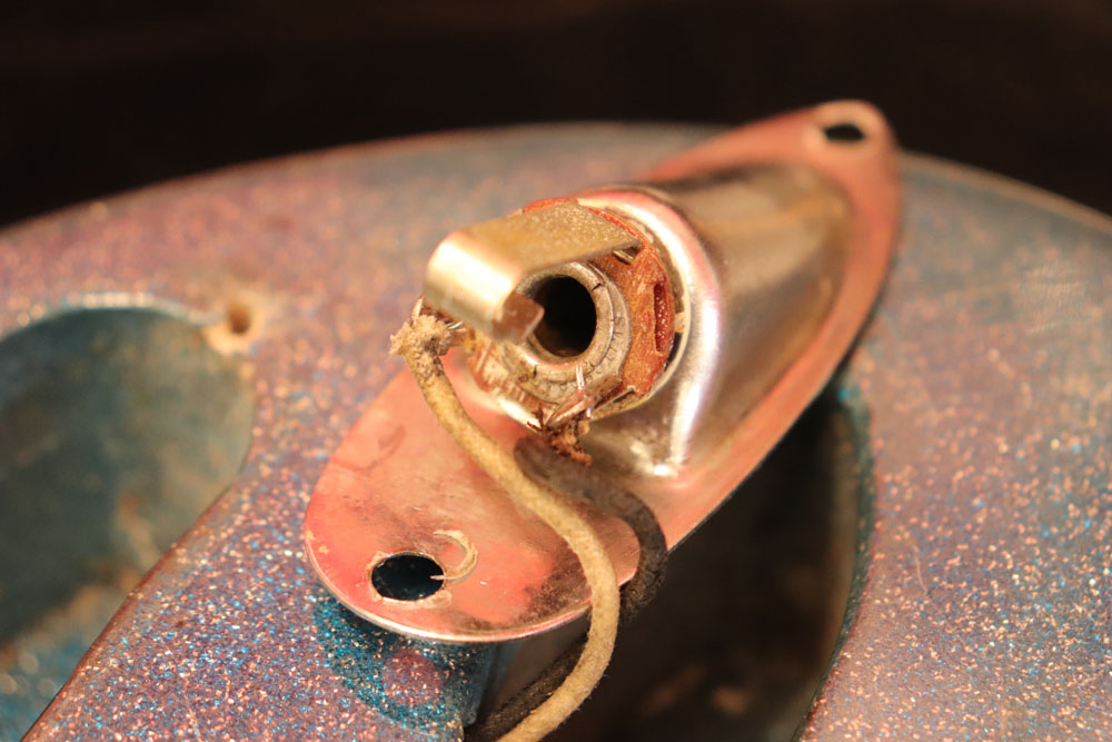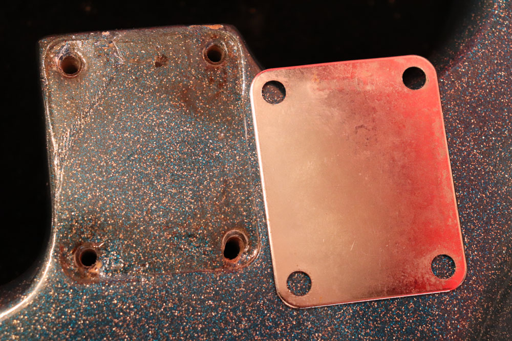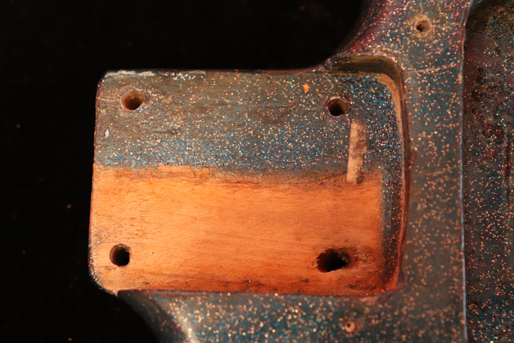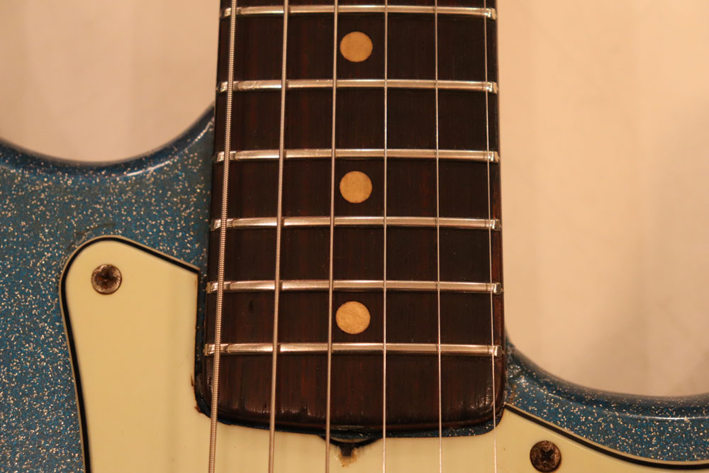 塗装自体は年式相応な古い時代に塗装されているようで、ボディ内部には“BSP”と言う文字が、はんだコテを使った焼印で刻まれています これはフェンダー・ファクトリーが再塗装(60年代のカタログにはユーザー向けにカラーチャート内のカラーでの再塗装を受け付けている、と表記されていました) を請けをった時にボディ内部に施す“印し”の方法の一つと同様です 又、ボディ全体はクリアトップコートのオーバースプレーが施されている様に見えますが、セルロース・ラッカーでのスパークル・フィニッシュの場合は、トップコートの経年劣化により粒の粗い大きいメタルフレークが表面に現れて来てザラザラしてしまったた肌を治める為に、後年になって施されているのではないかと考えています