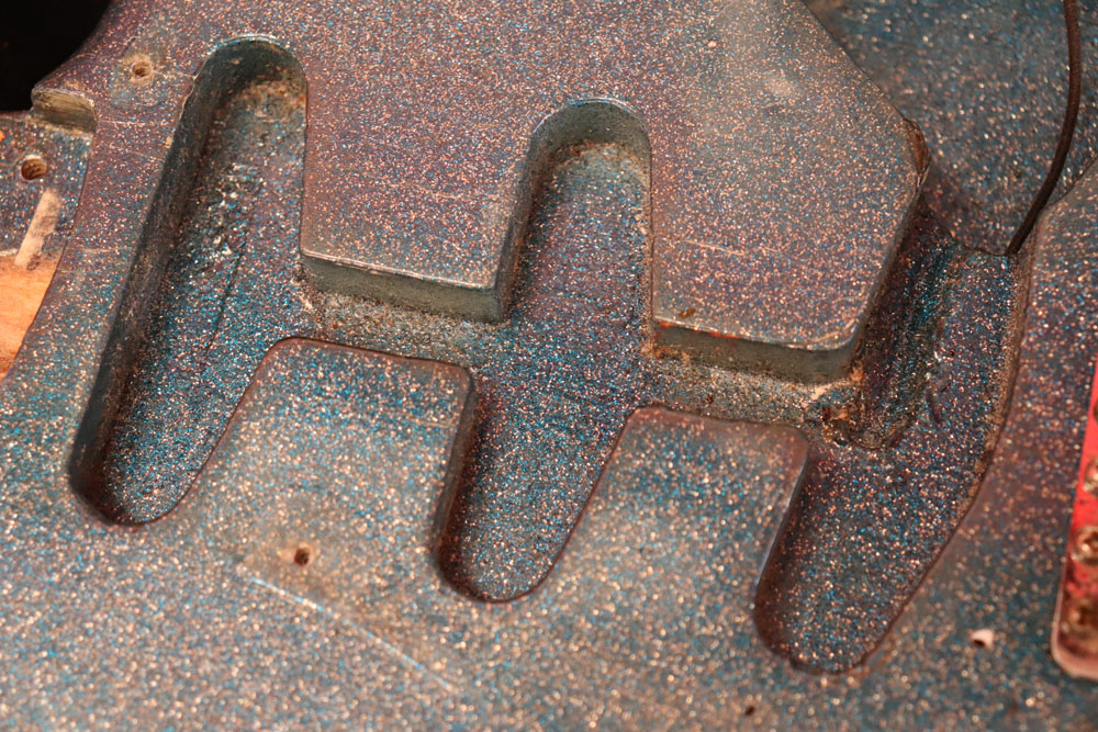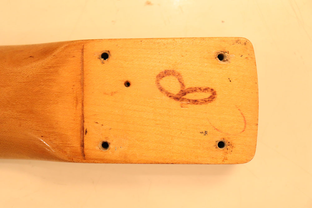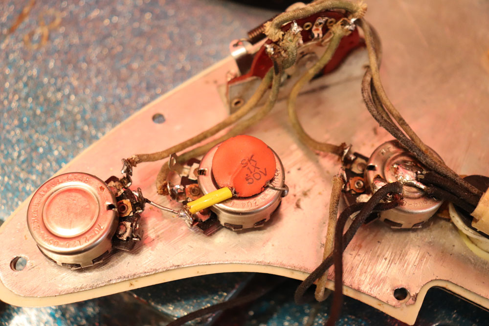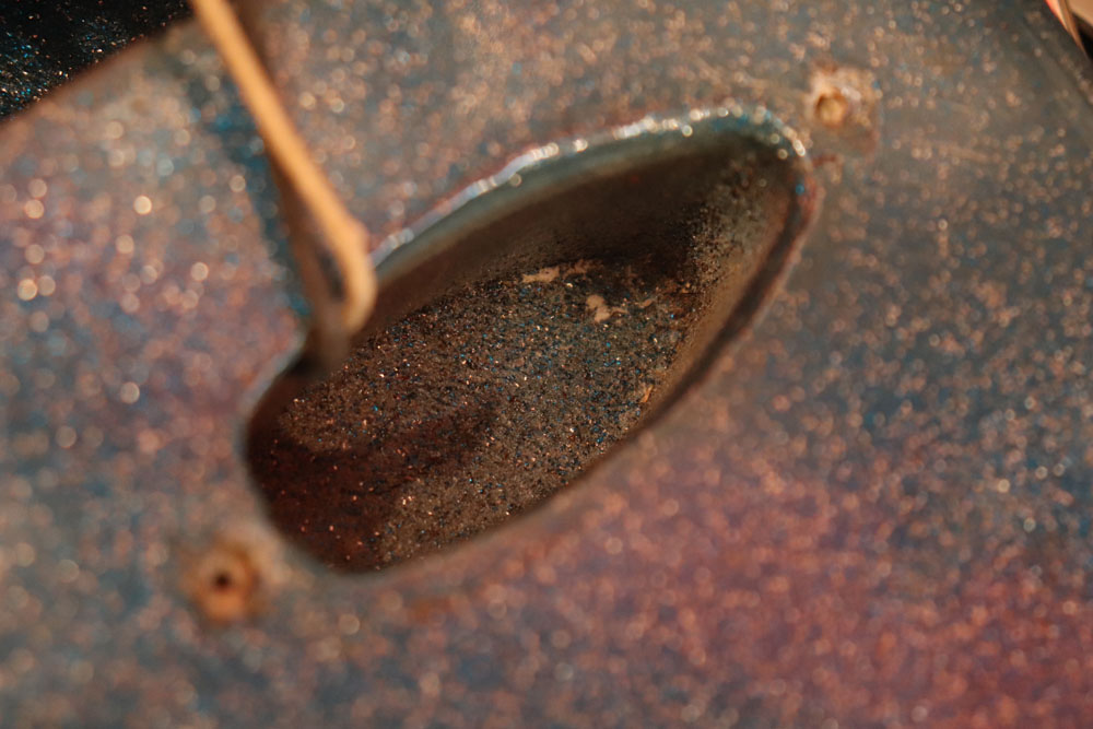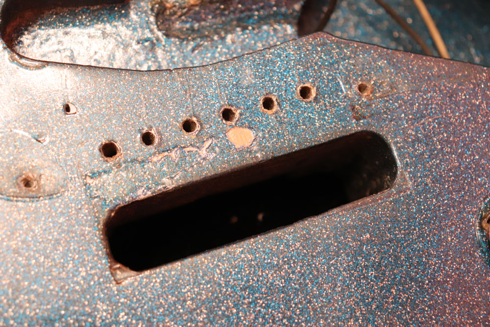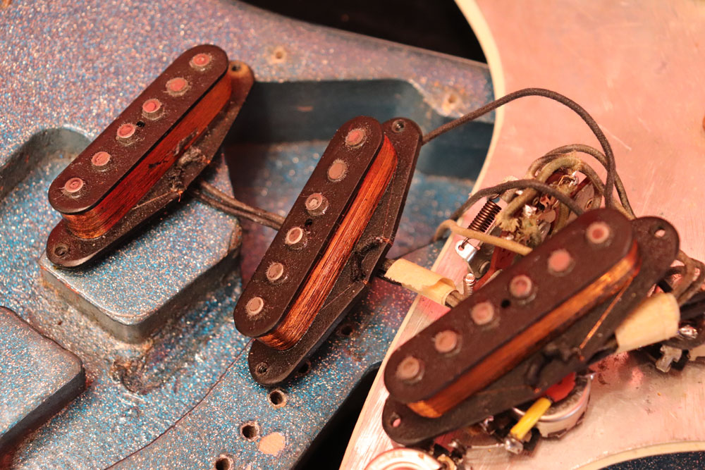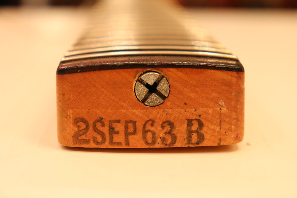 塗装自体は年式相応な古い時代に塗装されているようで、ボディ内部には“BSP”と言う文字が、はんだコテを使った焼印で刻まれています これはフェンダー・ファクトリーが再塗装(60年代のカタログにはユーザー向けにカラーチャート内のカラーでの再塗装を受け付けている、と表記されていました) を請けをった時にボディ内部に施す“印し”の方法の一つと同様です 又、ボディ全体はクリアトップコートのオーバースプレーが施されている様に見えますが、セルロース・ラッカーでのスパークル・フィニッシュの場合は、トップコートの経年劣化により粒の粗い大きいメタルフレークが表面に現れて来てザラザラしてしまったた肌を治める為に、後年になって施されているのではないかと考えています