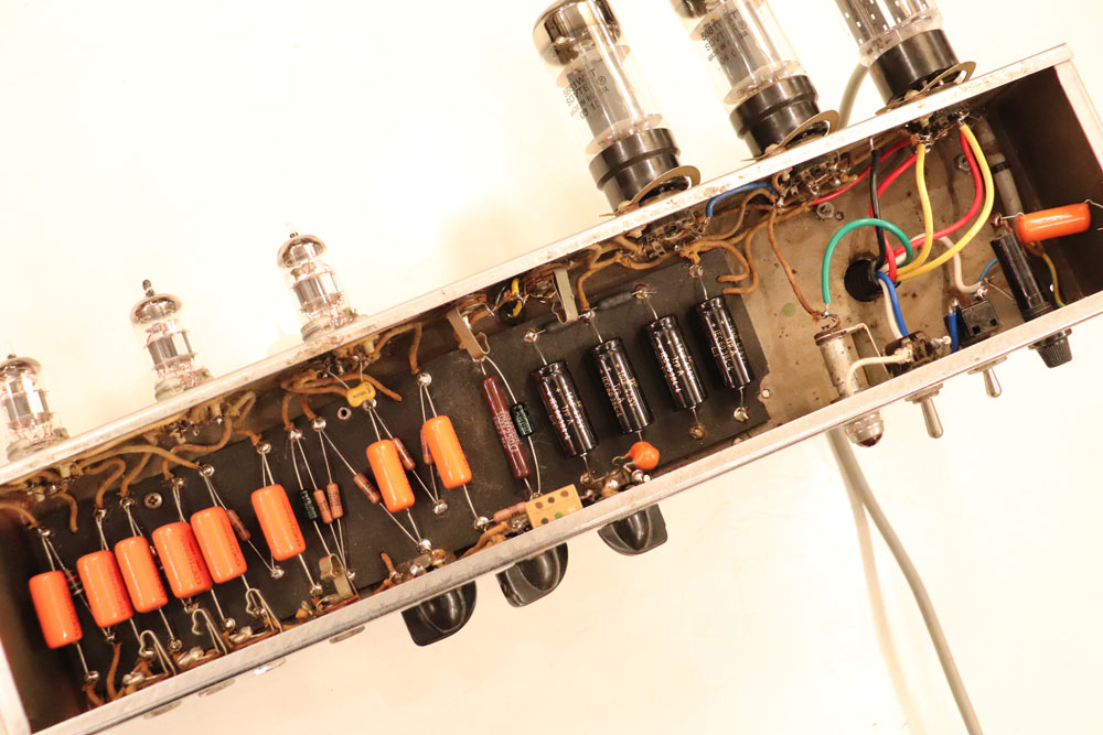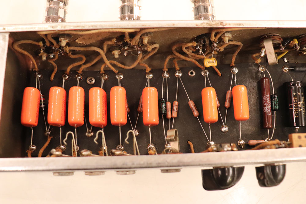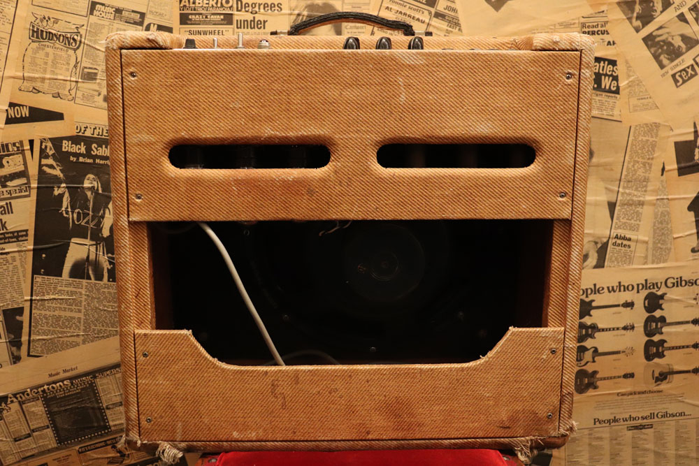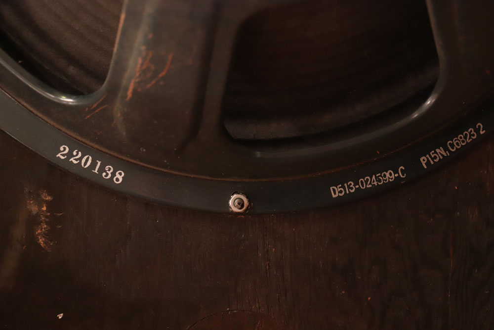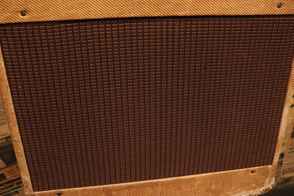 内容は、実用的なモディファイが施され、オリジナルのプリ管“AY-7”は“よりゲインの高いAX-7”に変更し、電源トランスは少し後年のツイード・アンプに採用されている“TRIAD”製に交換、パワー・トランスはマーキュリー・マグネット製に載せ替えられており、キャパシター類もリプレイスされていますので、レストアを兼ねて、少し歪みを強くしたモディファイが施されているようです また、スピーカーは1951年デイトの15インチ・ジェンセン製アルニコ・スピーカーが載せれれています