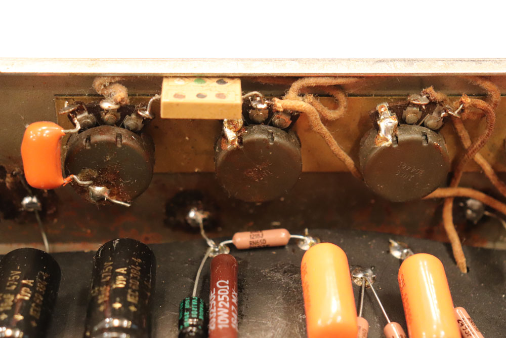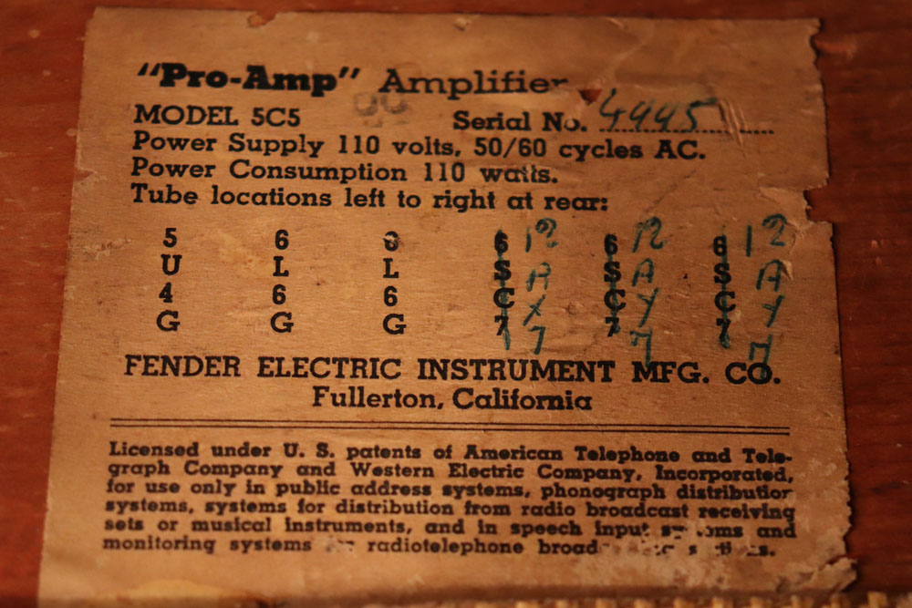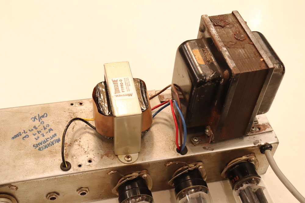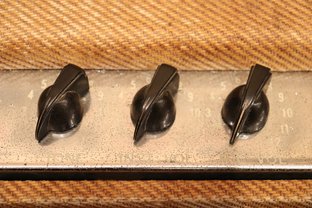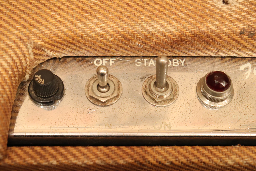 内容は、実用的なモディファイが施され、オリジナルのプリ管“AY-7”は“よりゲインの高いAX-7”に変更し、電源トランスは少し後年のツイード・アンプに採用されている“TRIAD”製に交換、パワー・トランスはマーキュリー・マグネット製に載せ替えられており、キャパシター類もリプレイスされていますので、レストアを兼ねて、少し歪みを強くしたモディファイが施されているようです また、スピーカーは1951年デイトの15インチ・ジェンセン製アルニコ・スピーカーが載せれれています