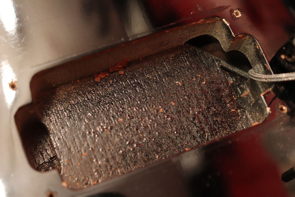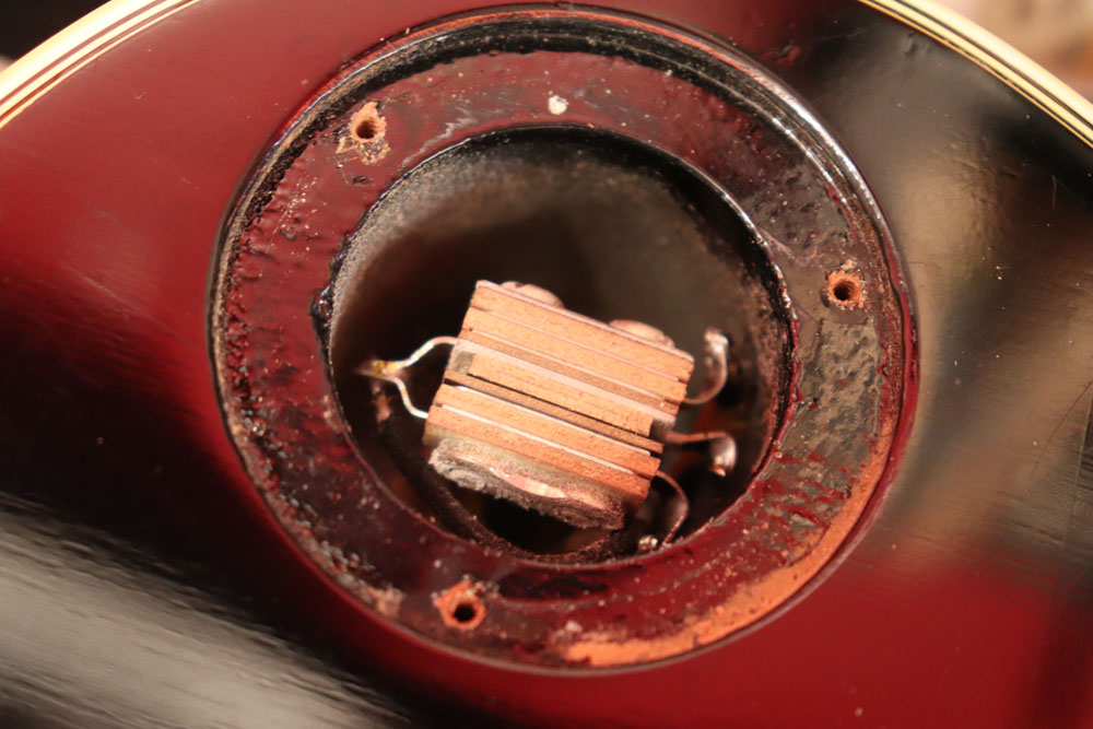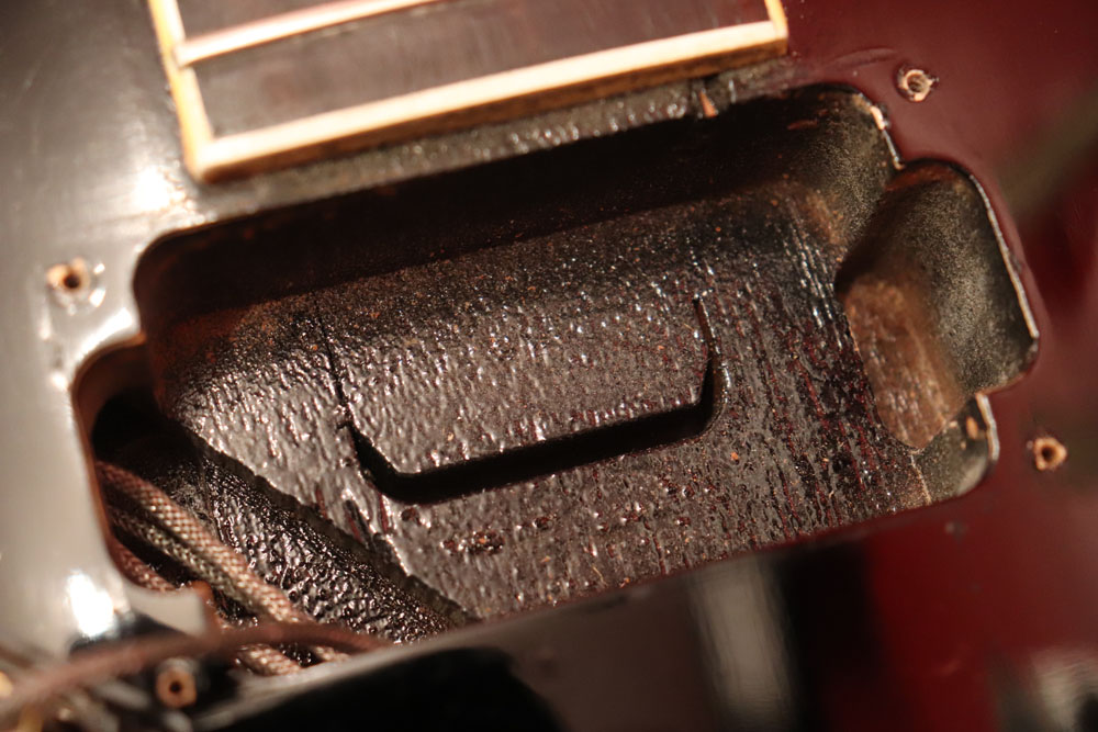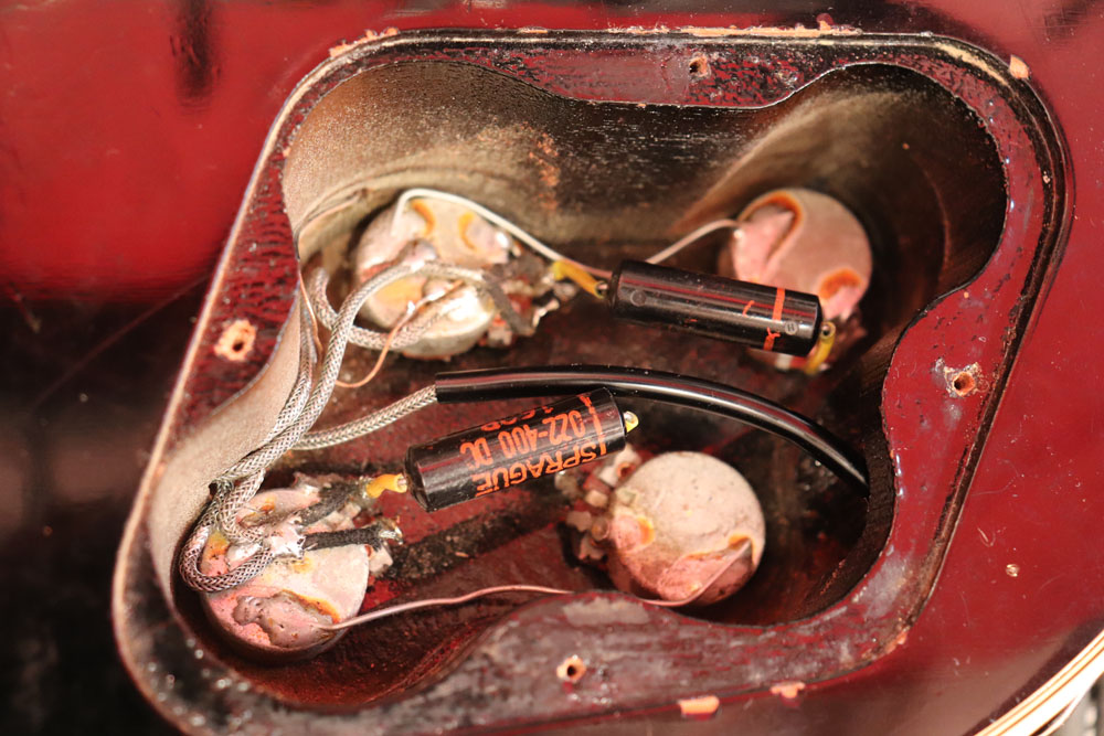 こちらは、ケースの保管期間が長いヴィンテージ・ギターに良く見られる症状の一つですが、ボディトップにギター・シールドによるウエアがある部分が少しだけ見られますが、その他はバックル・ウエア等も殆ど無く、経年劣化し易いゴールド・パーツもとても綺麗な状態を留めた、ニア・ミント・コンディション! 探しても滅多に見つからない機体です