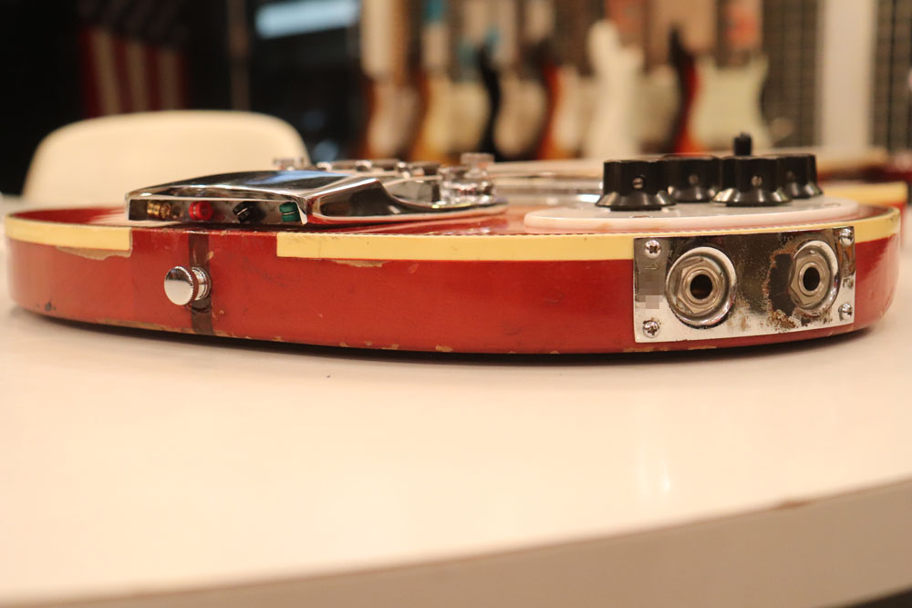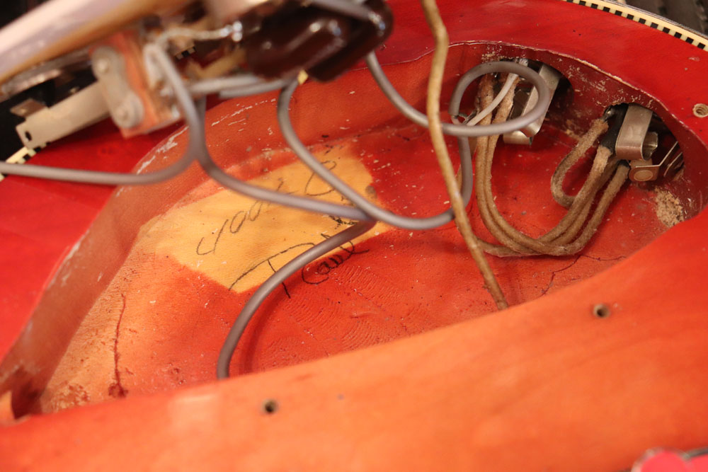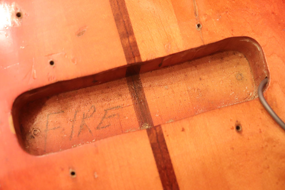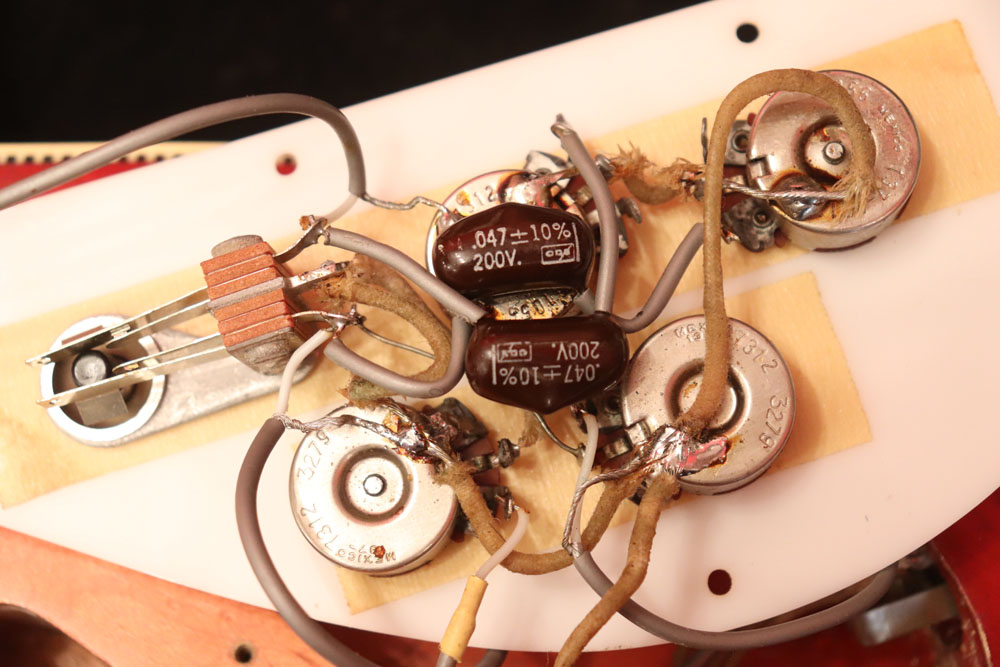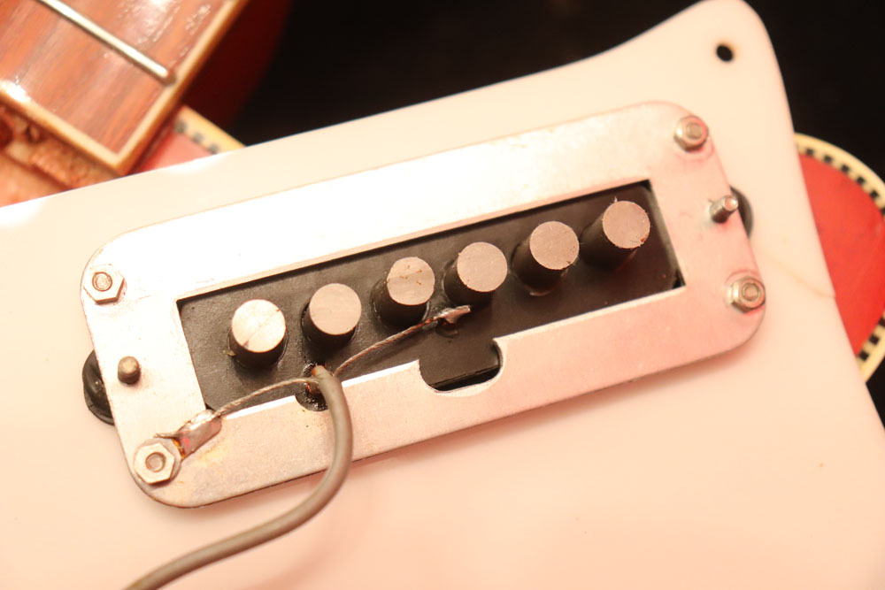 フロント・ピックアップ、トーン調整用のキャパシターが一つ外されており、ペグが損傷しやすいオリジナルのグローバー・ペグからクルーソン・タイプのペグに換装されていまが、ピックアップを含め、その他のパーツはオリジナルです