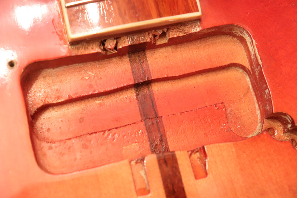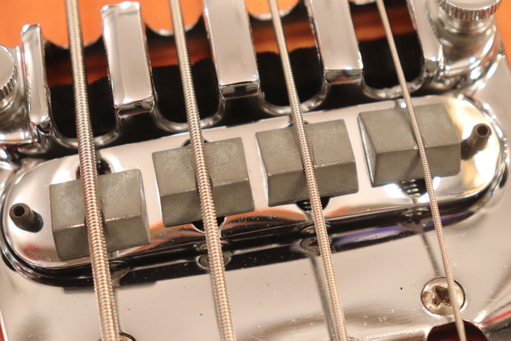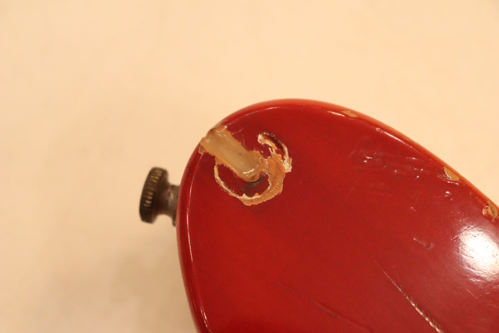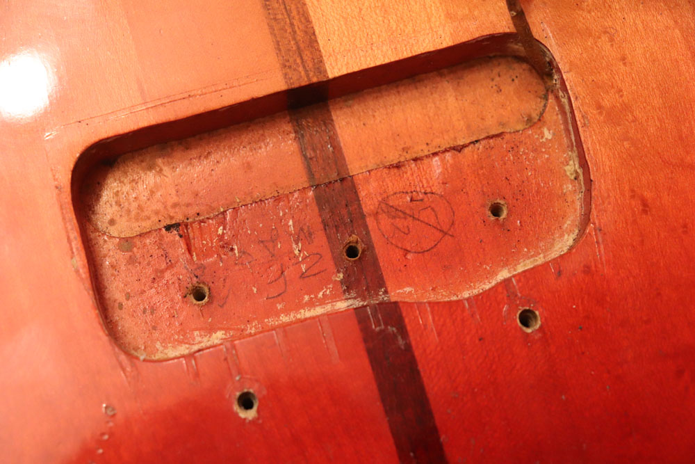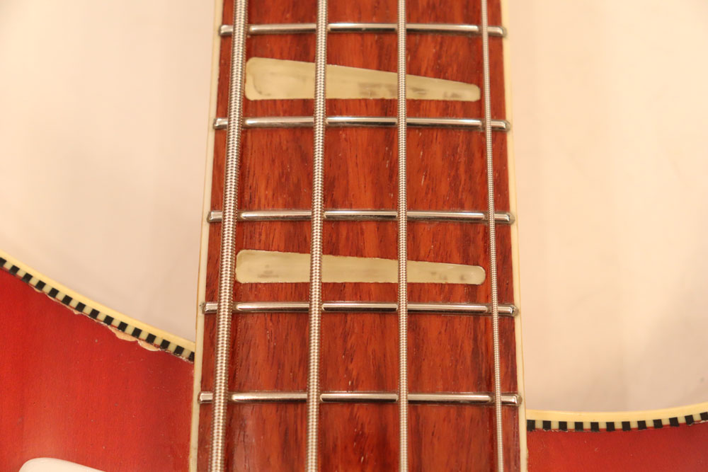 フロント・ピックアップ、トーン調整用のキャパシターが一つ外されており、ペグが損傷しやすいオリジナルのグローバー・ペグからクルーソン・タイプのペグに換装されていまが、ピックアップを含め、その他のパーツはオリジナルです