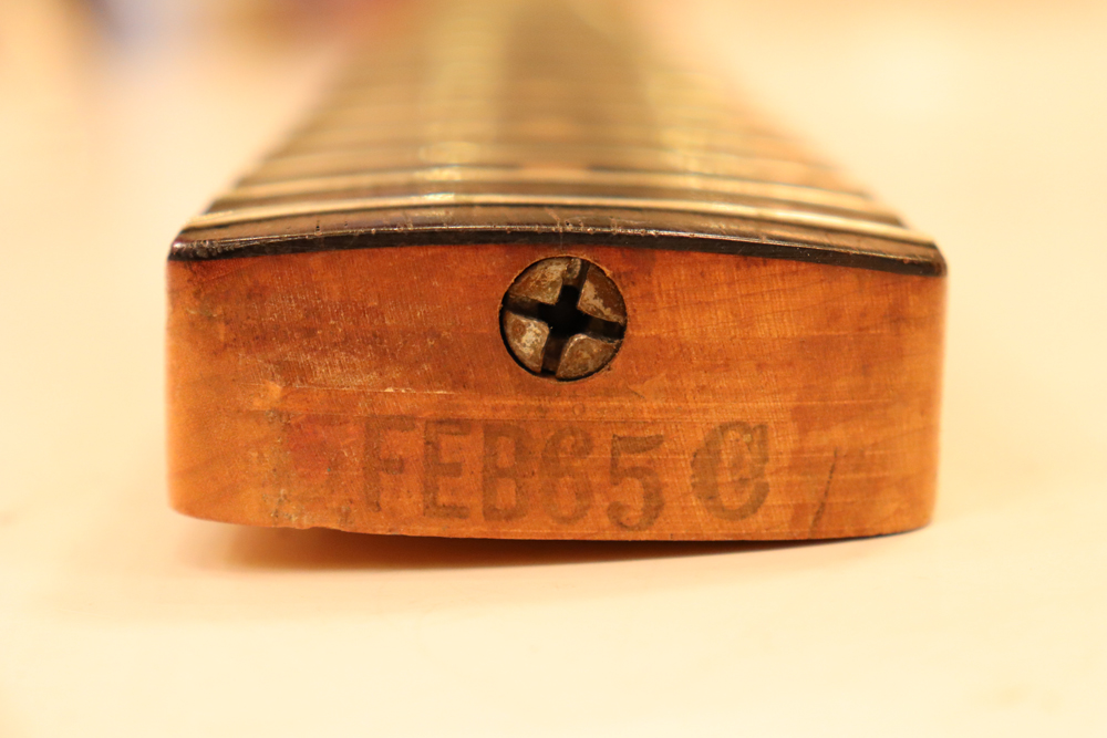 勿論、CBC最終期ならではな、よく目の詰まった濃い茶色のローズウッド指板にはクレイドットのポジションマーカーを持つ最後の仕様です